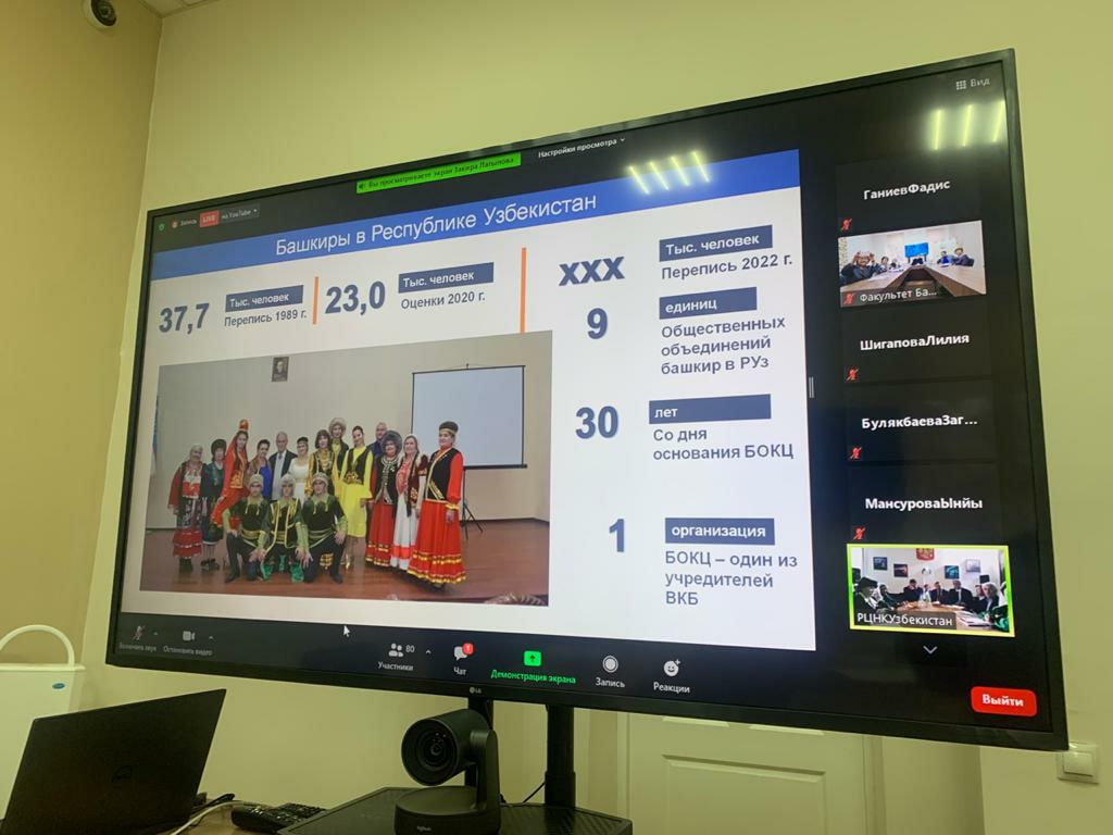6 февраля 2021 г. прошла первая дистанционная встреча с известными зарубежными башкирскими учеными и деятелями культуры Республики Узбекистан в рамках реализации проекта «Международная научно-образовательная интернет-платформа «Мы сами – башкиры».