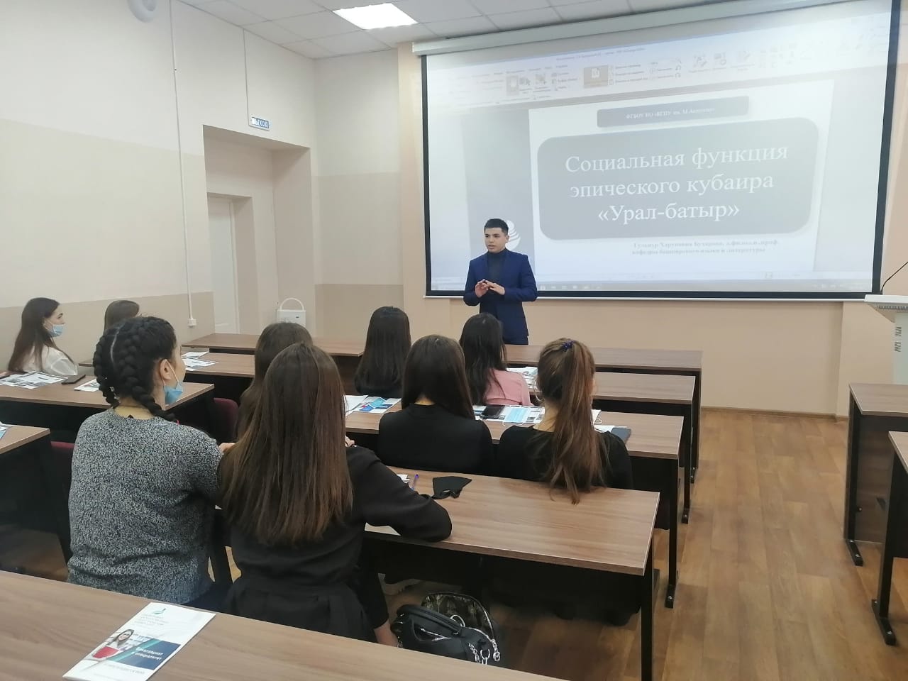 Состоялась встреча с деканом, преподавателями, студенческим активом факультета башкирской филологии. Д.ф.н., проф. Бухарова Г.Х. прочитала лекцию на тему «Социальная функция эпоса «Урал батыр».