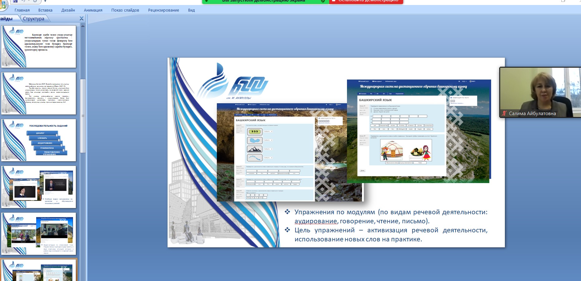 26 ноября 2021 года заведующая кафедрой башкирского языка и литературы Тагирова С.А. и студенты 3 курса по направлению «Родной (башкирский) язык и литература» ЗБЯС_31_19 участвовали в Межвузовском научно-методическом семинаре, посвященном актуальным проблемам преподавания башкирского языка в системе среднего профессионального образования РБ. В рамках семинара были организованы выступления студентов на тему «Современные проблемы сохранения и развития родных языков и литератур», состоялась презентация учебного пособия «Башкирский язык. Новый взгляд» (Уфа, 2021). Тагирова С.А. рассказала преподавателям башкирского языка и студентам колледжей республики про Международную систему обучения башкирскому языку, платформу «Мы – сами башкиры» и подчеркнула возможности эффективного использования данных ресурсов в их профессиональной деятельности. В конце семинара был организован Круглый стол по актуальным проблемам преподавания башкирского языка в системе среднего профессионального образования.