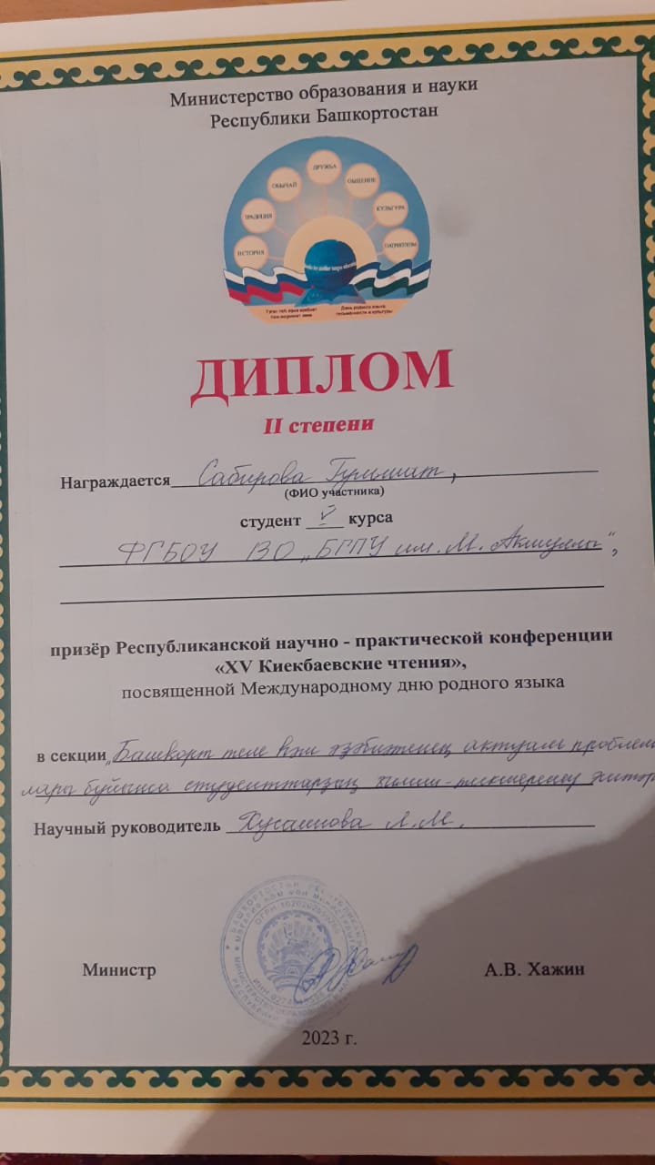 - Мухаметдинова Эльмира, студент 1 курса. Тема "Үткәл ауылы нисек барлыҡҡа килгән" (научный руководитель Алибаев З.А.).
