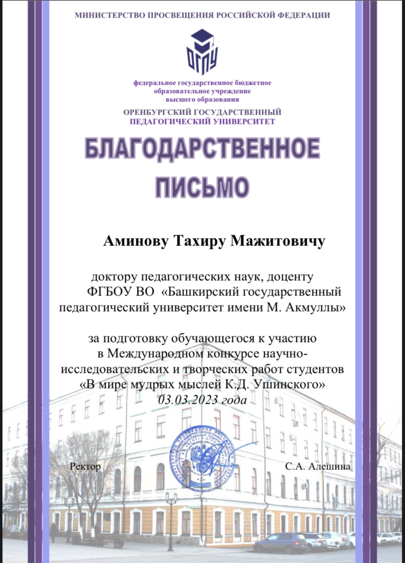 Студентка 2 курса факультета башкирской филологии – Галлямова Алина приняла участие в Международном конкурсе научно-исследовательских и творческих работ «В мире мудрых мыслей К. Д. Ушинского», где получила дипломом II степени.