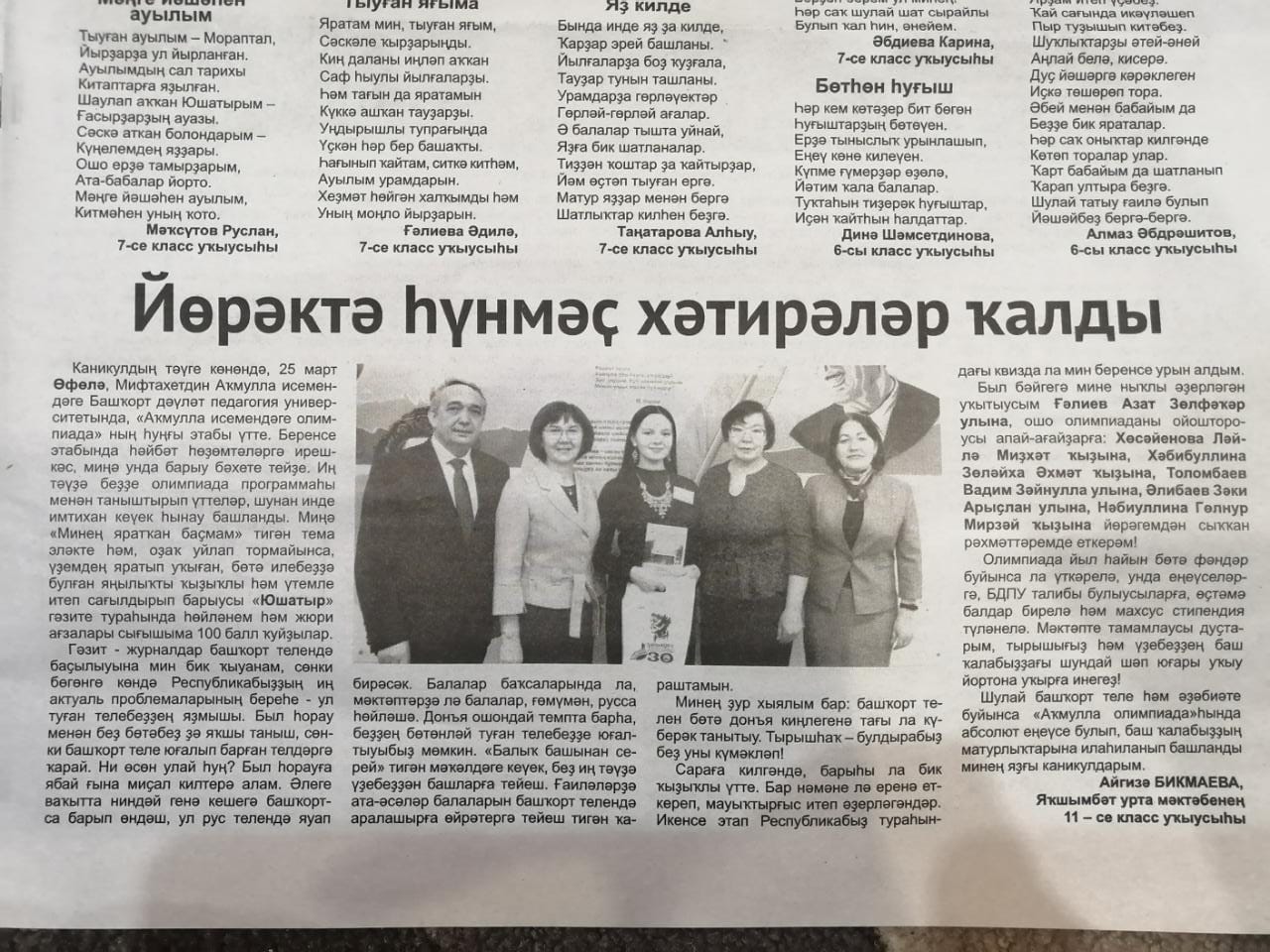 25 марта прошел заключительный тур Акмуллинской олимпиады по башкирскому языку. Обучающиеся 10-11-х классов и СПО приехали в БГПУ им. М. Акмуллы и очно прошли последнее испытание, а учащиеся 8-9-х классов выполняли задания дистанционно. Для участников очного тура была подготовлена насыщенная программа. С олимпиадниками работали как студенты факультета башкирской филологии, так и преподаватели факультета. Смело можем сказать, что довольными остались все участники данного мероприятия. Многие обучающиеся и их учителя после олимпиады писали сообщения, звонили по телефону со словами благодарности. А учащиеся 11-го класса Якшимбетовской средней школы Куюргазинского района Бикмаева Айгиза написала статью и опубликовала в районной газете "Юшатыр". Айгиза благодарит своего учителя башкирского языка и литературы А.З. Галиева за помощь в подготовке к олимпиаде и всех организаторов Акмуллинской олимпиады. Нам очень важна обратная связь, и, в свою очередь, от всей души желаем, чтобы Айгиза успешно сдала все ЕГЭ и осуществила свою мечту  - стала студентом Акмуллинского университета. Ждем Айгизу на факультете башкирской филологии.