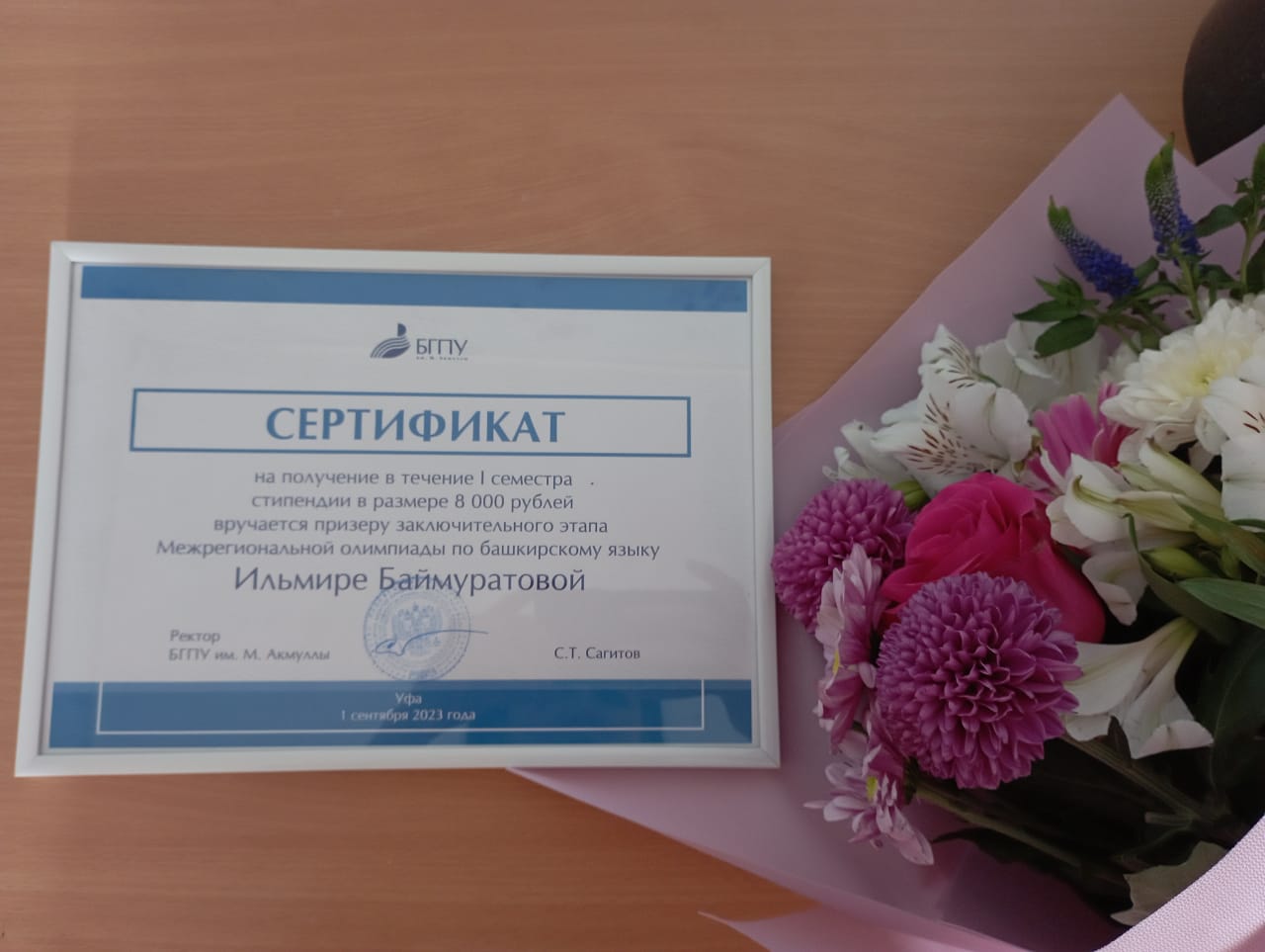 Поздравляем студентку первого курса факультета башкирской филологии Ильмиру Баймуратову с получением сертификата на стипендию!