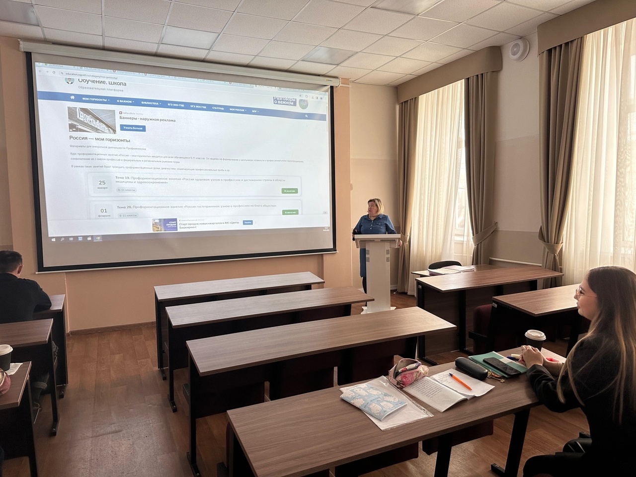 Заместитель декана по воспитательной работе и молодежной политике, Галина Галима Галимьяновна в формате беседы познакомила студентов 3 курсов, будущих педагогов, с профориентационным курсом, информационными, методическими материалами и с тонкостями проведения профориентации со школьниками, а также предложила студентам использовать данные материалы курса во время прохождения своей будущей практики.