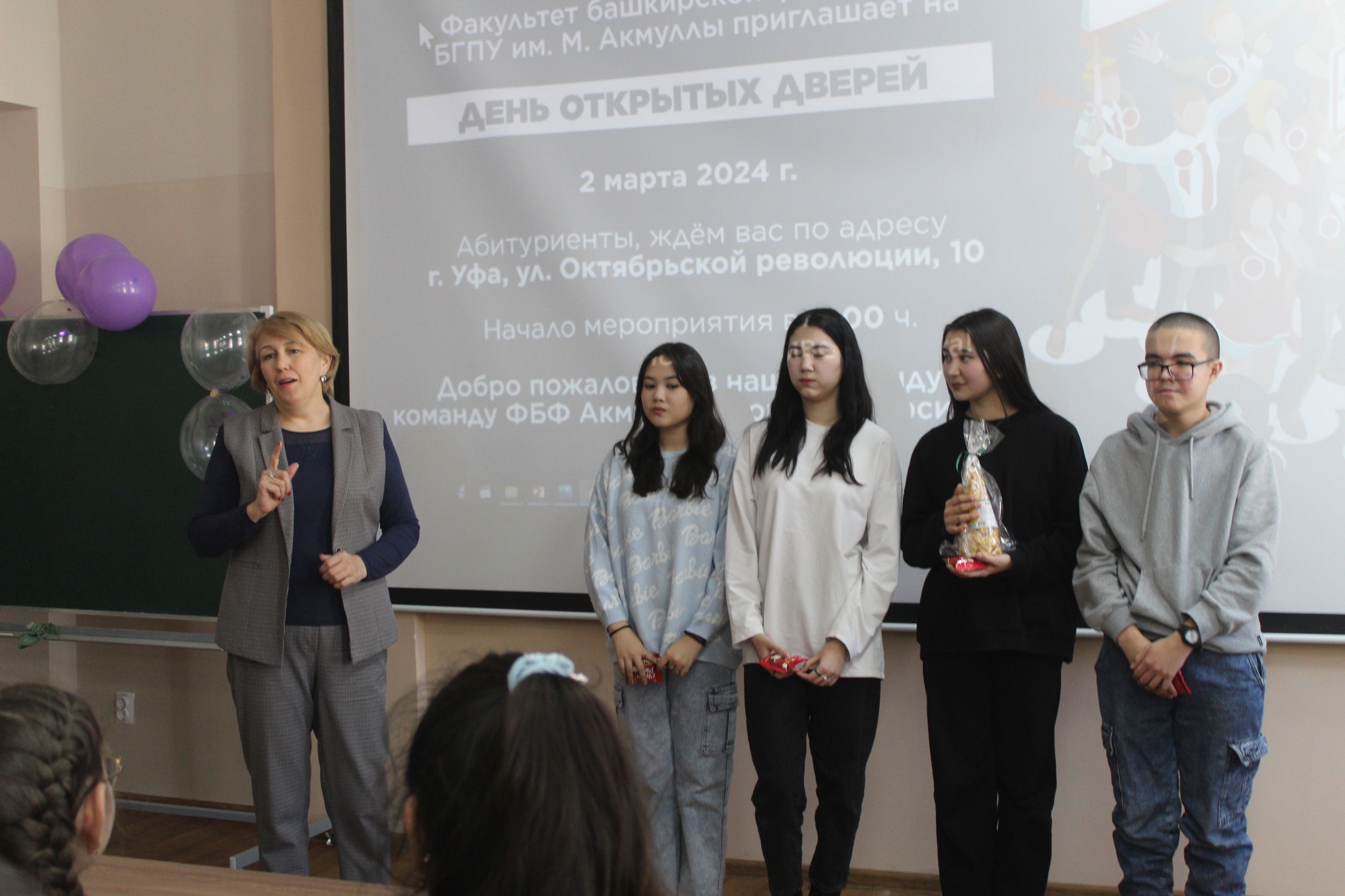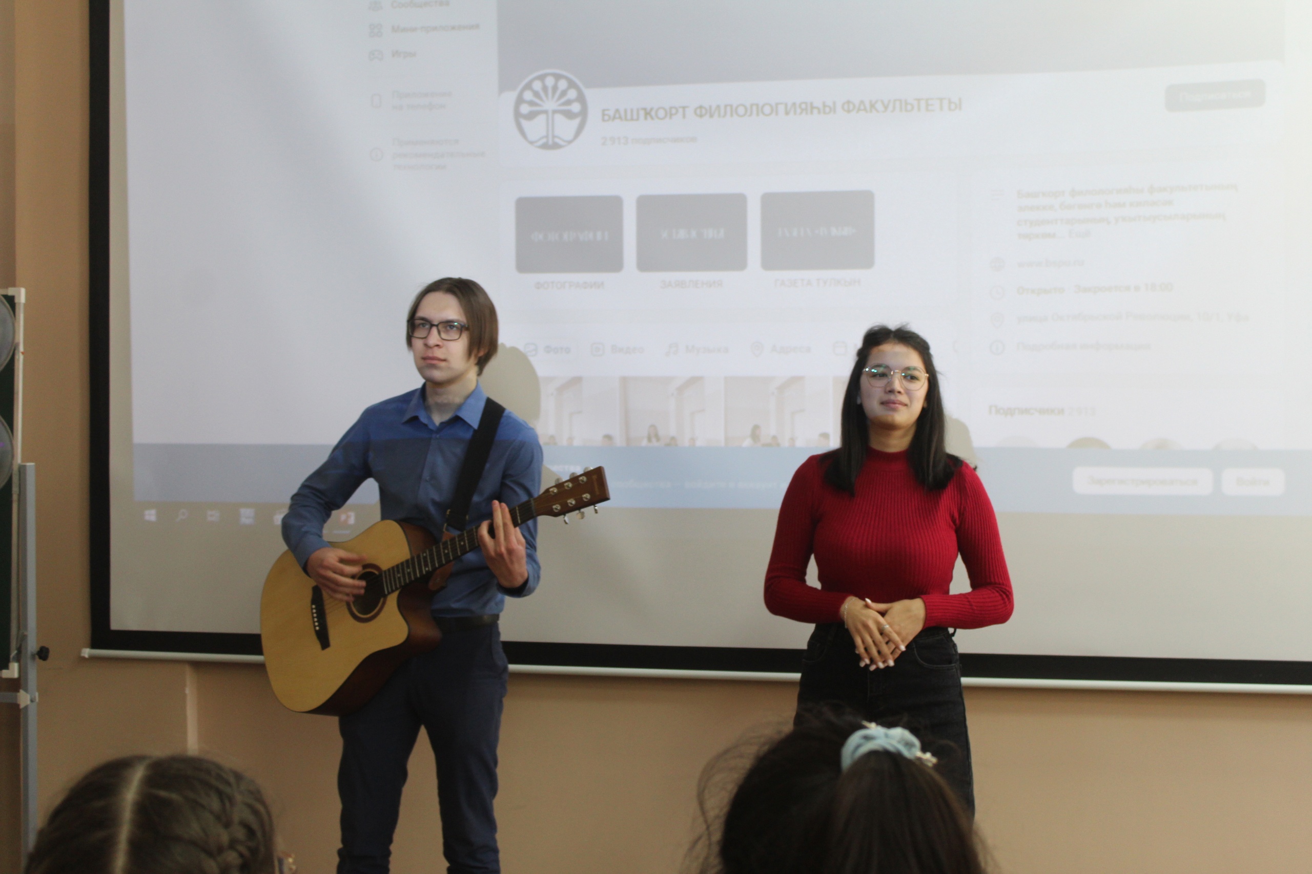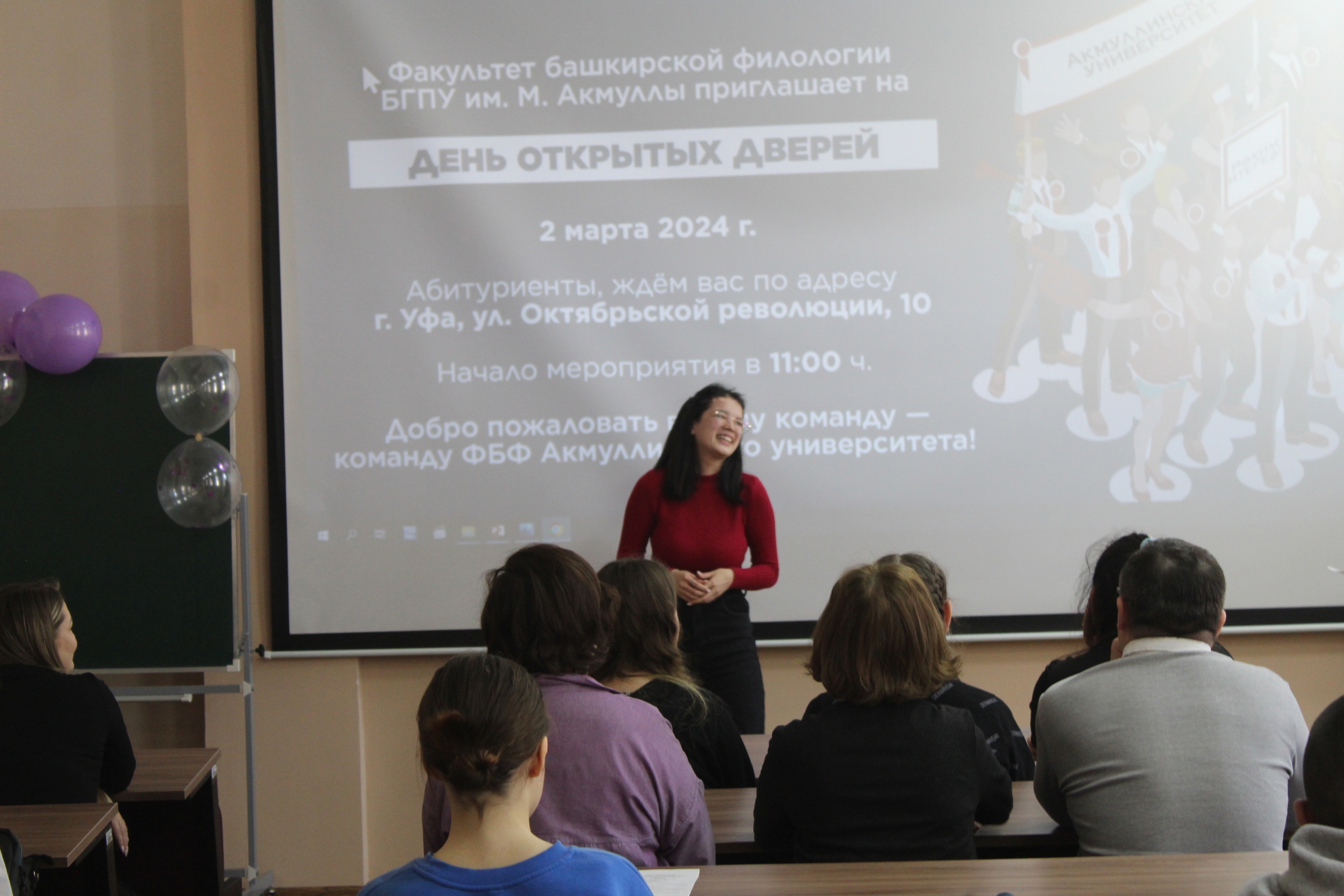 2 марта факультет башкирской филологии вновь распахнул свои двери для абитуриентов.  В этот раз к нам факультет пришли обучающиеся из  различных учебных заведений города Уфы: БРГИ № 1 им. Р. Гарипова, УГБУ № 20 им. Ф.Х. Мустафиной,МАОУ "Башкирская гимназия №140 им. Зайнаб Биишевой, ГБОУ Республиканский инженерный лицей-интернат, лицей № 161, Инженерный Лицей № 83 имени Пинского М.С. при УГНТУ. Города и районы республик были представлены МОБУ «Башкирская Гимназия №9 им. К.Арсланова» (г. Мелеуз), СОШ №2 с. Аскино (с. Аскино, Аскинский р-н), СОШ №4 им. Д.С. Тикеева (с. Иглино, Иглинский р-н).