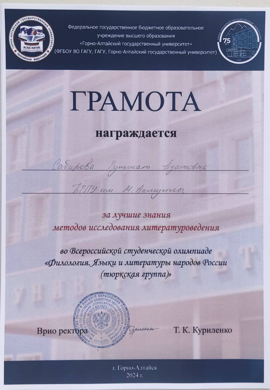 - «За лучшие знания методов исследования литературоведения» – Гульшат Сабирова.