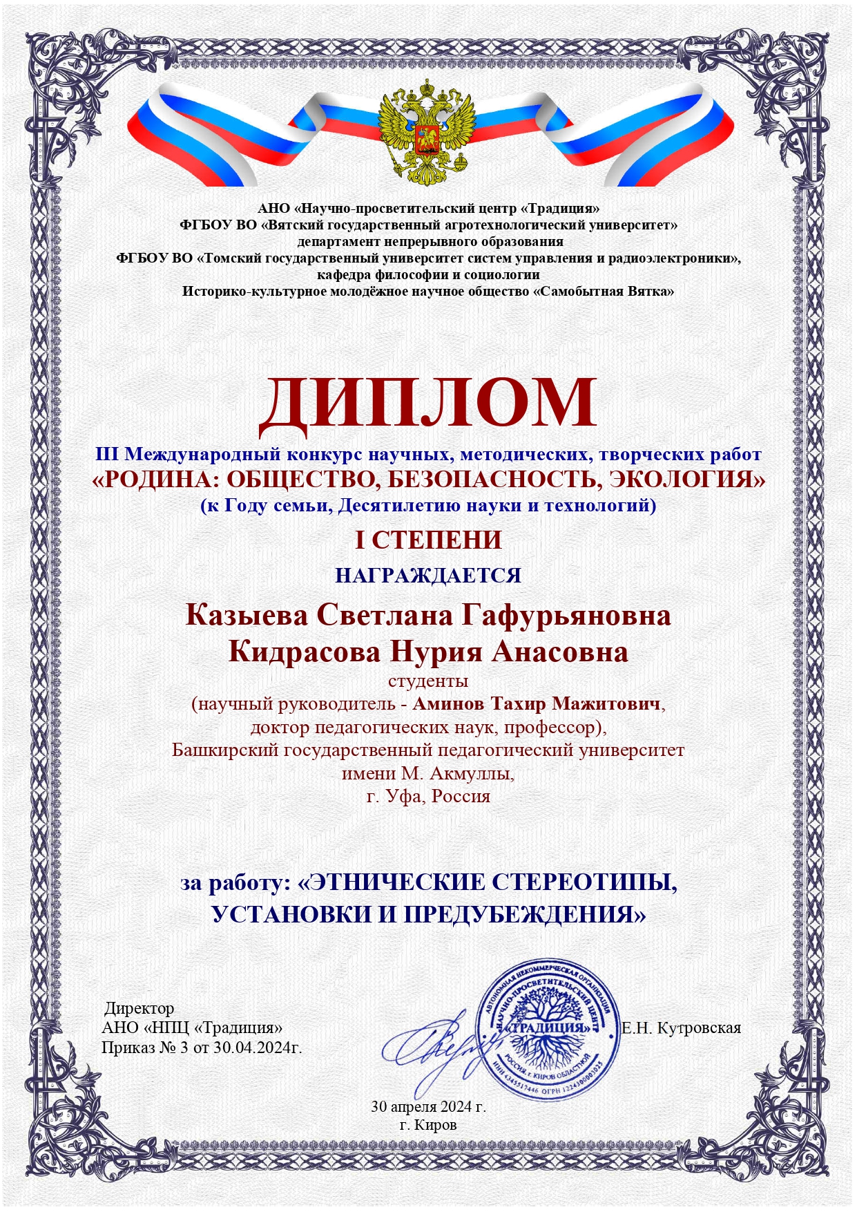 Студенты 2 курса факультета башкирской филологии Казыева Светлана и Кидрасова Нурия (руководитель профессор Т.М. Аминов) приняли участие в III Международном конкурсе научных и творческих работ «РОДИНА: ОБЩЕСТВО, БЕЗОПАСНОСТЬ, ЭКОЛОГИЯ», проходившем в г. Кирове. За видеоурок «Этнические стереотипы, установки и предубеждения», подготовленный конкурсантами, студенткам присудили почетное 1 место.