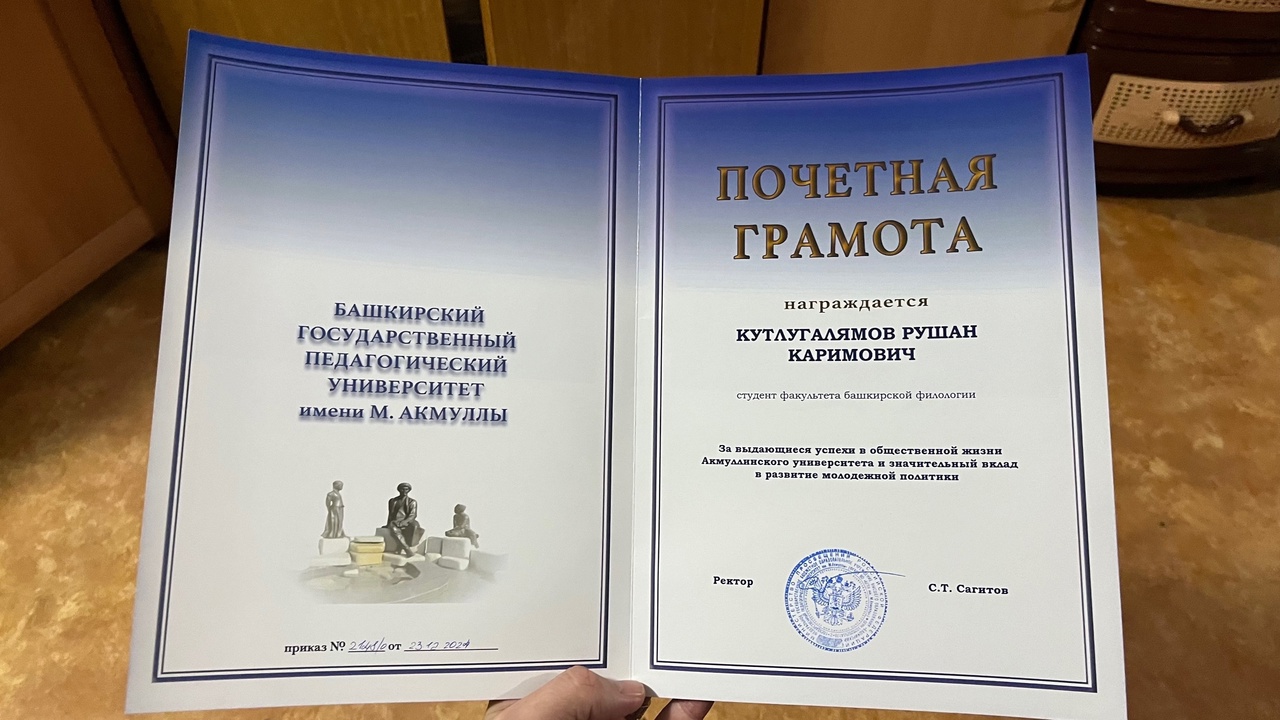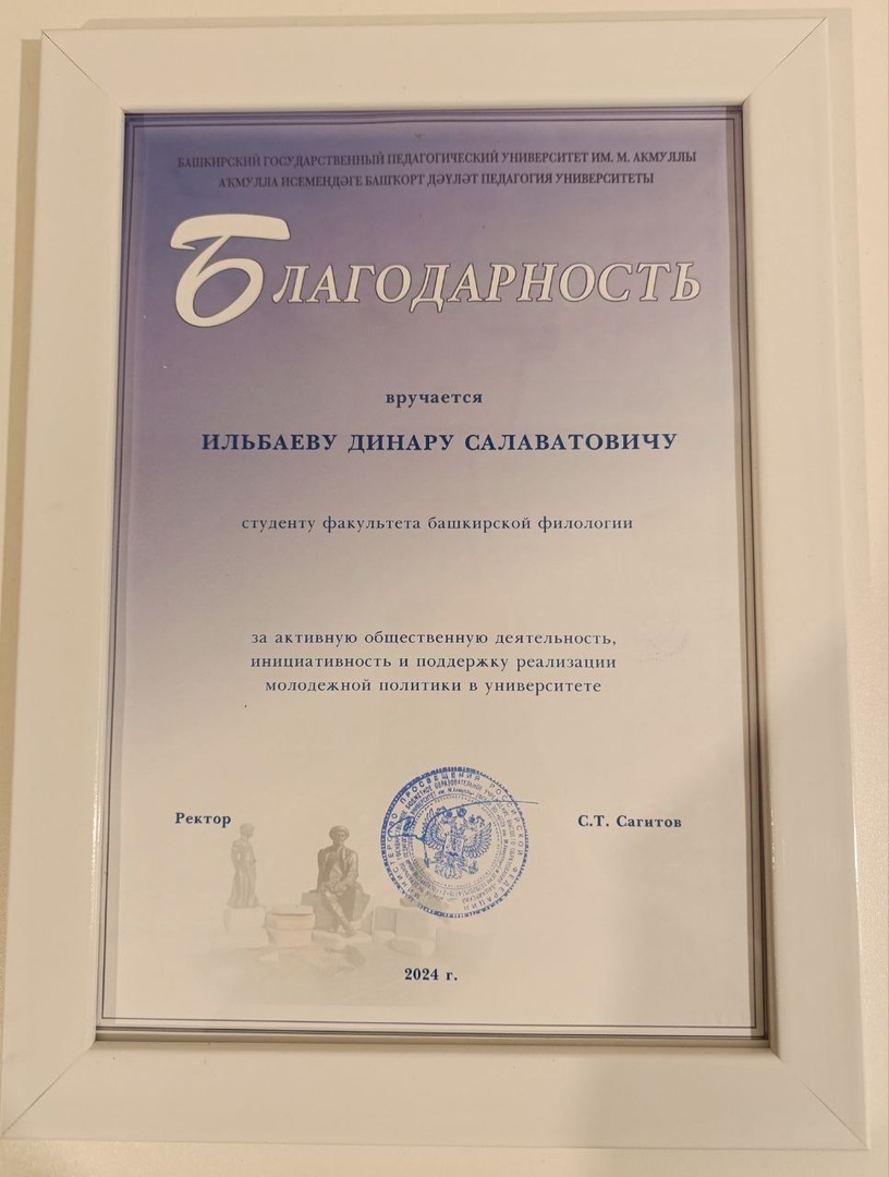 Благодарственным письмом Акмуллинского университета за активную общественную деятельность, инициативность и поддержку реализации молодежной политики в университете награжден: