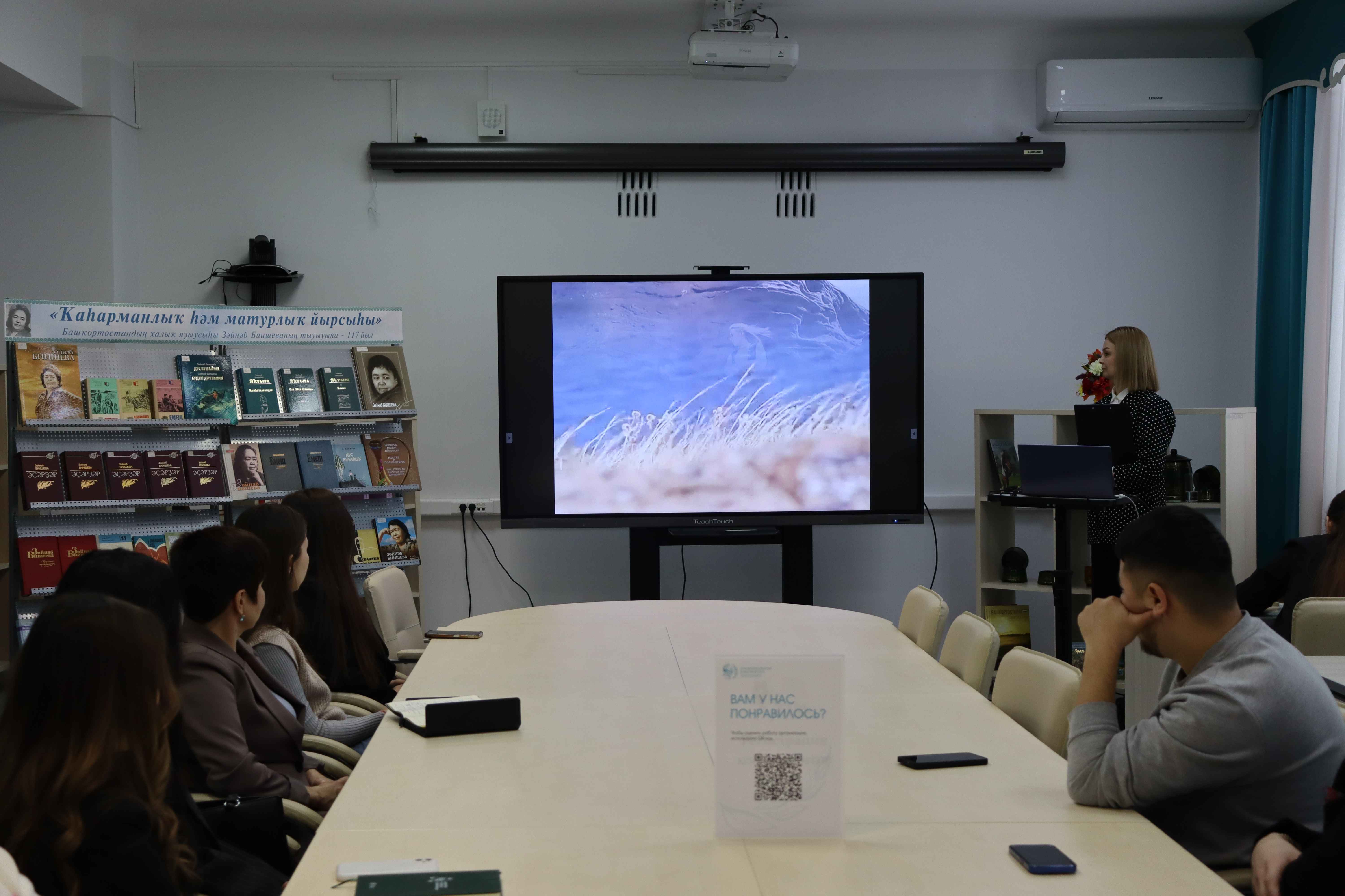 О жизни творчестве Биишевой студентам рассказал ведущий библиотекарь отдела башкирской литературы и краеведения Мадина Муллабаева. Лектор сделала попытку в своей лекции рассказать о жизни и творчестве писательницы устами самой писательницы. Лекция была построена на диалоге двух человек: ведущего и самой писательницы. Ведущая обращалась с вопросами к определенному периоду ее жизни и словно сама Зайнаб Биишева отвечала на ее вопросы с экрана. Так слушатели услышали с уст самой писательницы рассказ об ее не простом детстве и взаимоотношениях с мачехой, которую до конца жизни ценила и уважала несмотря на ее непростой характер. А также студенты прослушали песни на ее стихотворения, просмотрели отрывки художественных фильмов на ее произведения «Любовь и ненависть» и «Униженные», за написание которых Зайнаб Абдулловна была удостоена Государственной премии имени Салават Юлаева.