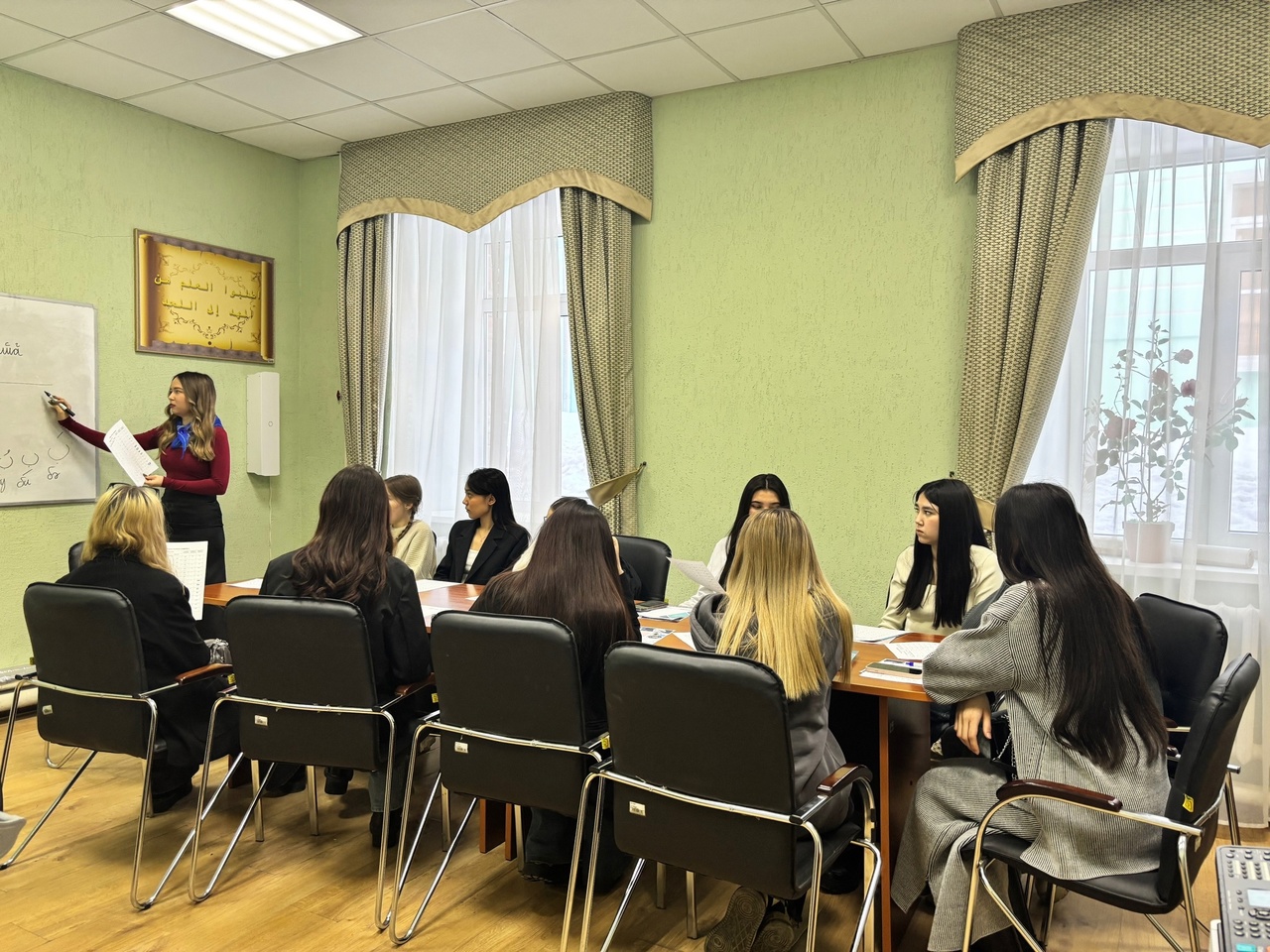 Школьники также разделились на две группы и поочередно посетили различные мастер-классы. Преподаватели и студенты восточного отделения организовали насыщенные занятия в рамках программы «Мир Востока». Султакаева Раушания Абдулхаевна, доцент кафедры тюркской и восточной филологии, провела интересную викторину по турецкому языку, что позволило участникам углубить свои знания о культуре, традициях и истории Турции, а также освоить особенности турецкого речевого этикета. Обучающиеся также посетили открытый урок Абдуллиной Алсу Гиндулловны, преподавателя китайского языка, где они научились распознавать и воспроизводить китайские тоны и даже смогли посчитать до 10, используя при этом жестикуляцию одной руки! Не менее интересным стал мастер-класс по арабской каллиграфии от студентки 3 курса Хисамиевой Карины. Она рассказала об основных правилах арабской письменности и ее особенностях и помогла юным участникам написать их первые слова, что стало для многих настоящим открытием.