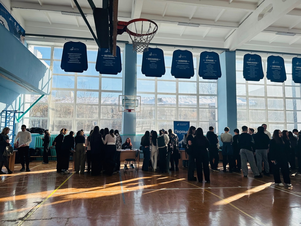 В торжественной обстановке был вынесен символ мужества и стойкости – копия Знамени Победы. Участники студенческого клуба военно-спортивной подготовки и патриотического воспитания «Яугир-Воин» передали знамя директору Института физической культуры и здоровья человека Николаю Черепанову, подчеркивая важность единства и связи между поколениями.
