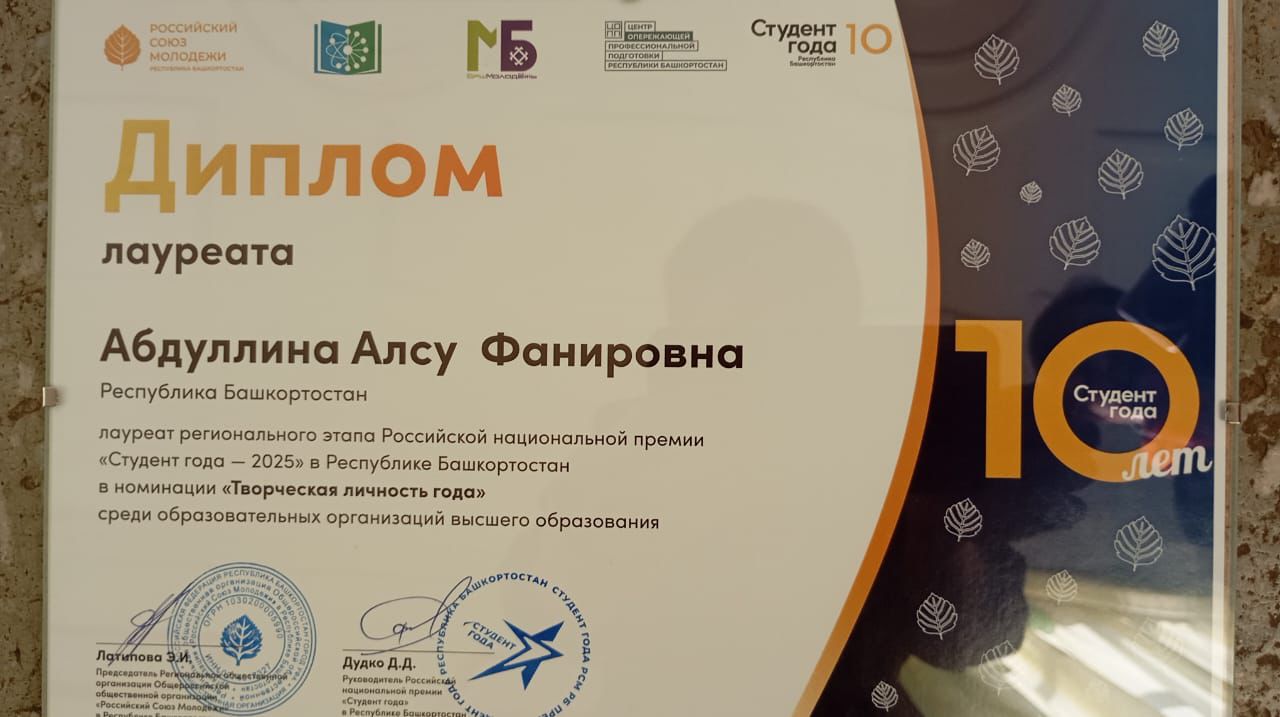 Одной из ярких звёзд этого года стала Абдуллина Алсу Фанировна, студентка факультета башкирской филологии, которая удостоена звания лауреата регионального этапа Российской национальной премии «Студент года – 2025» в номинации «Творческая личность года» среди образовательных организаций высшего образования.