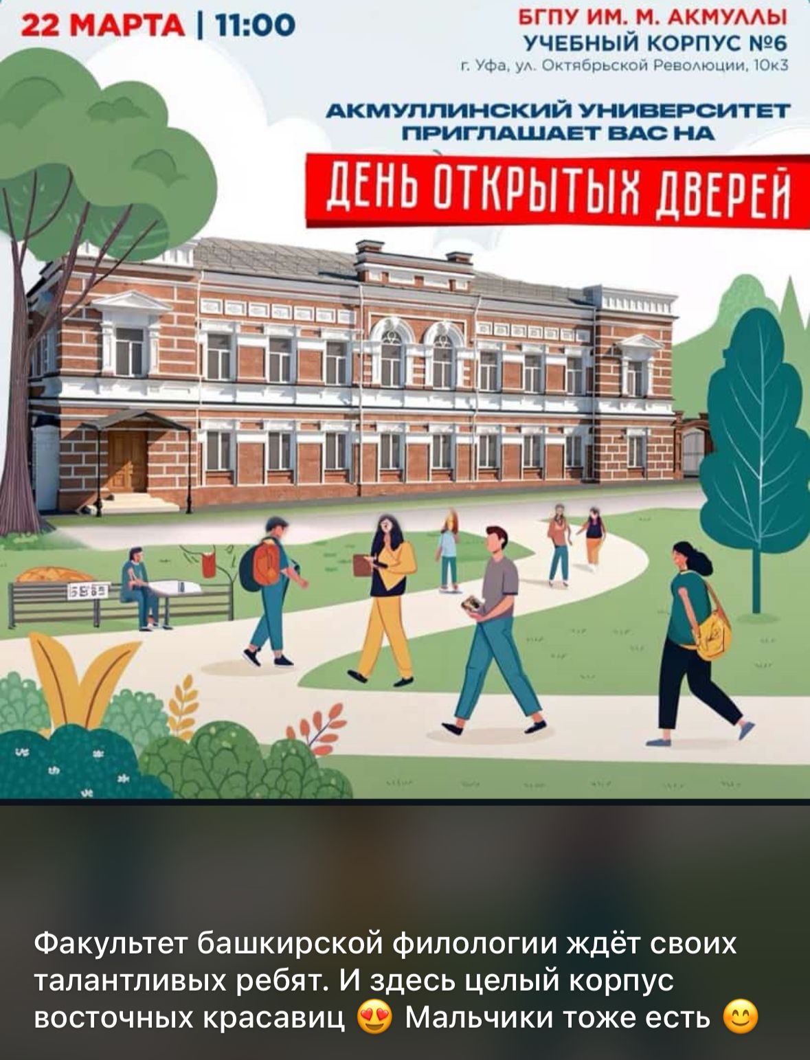 22 марта 2025 приглашаем обучающихся 10-11 классов на День открытых дверей  в 6 корпус, 202 аудиторию, к 11.00 ч. Абитуриентов ожидает знакомство с руководством и профессорско-преподавательским составом факультета башкирской филологии, квиз игра, мастер-классы по китайскому и арабскому языкам и др.
