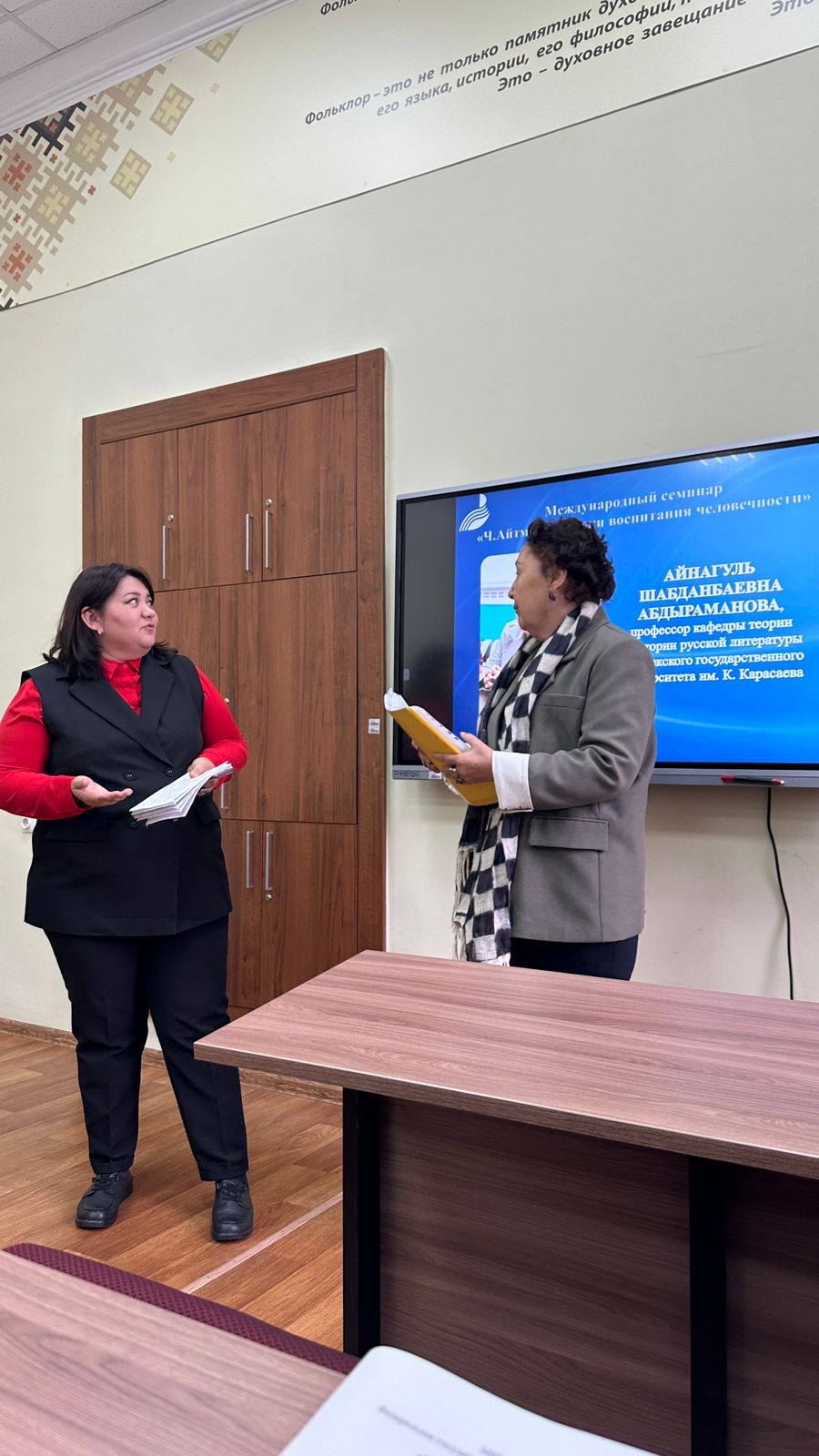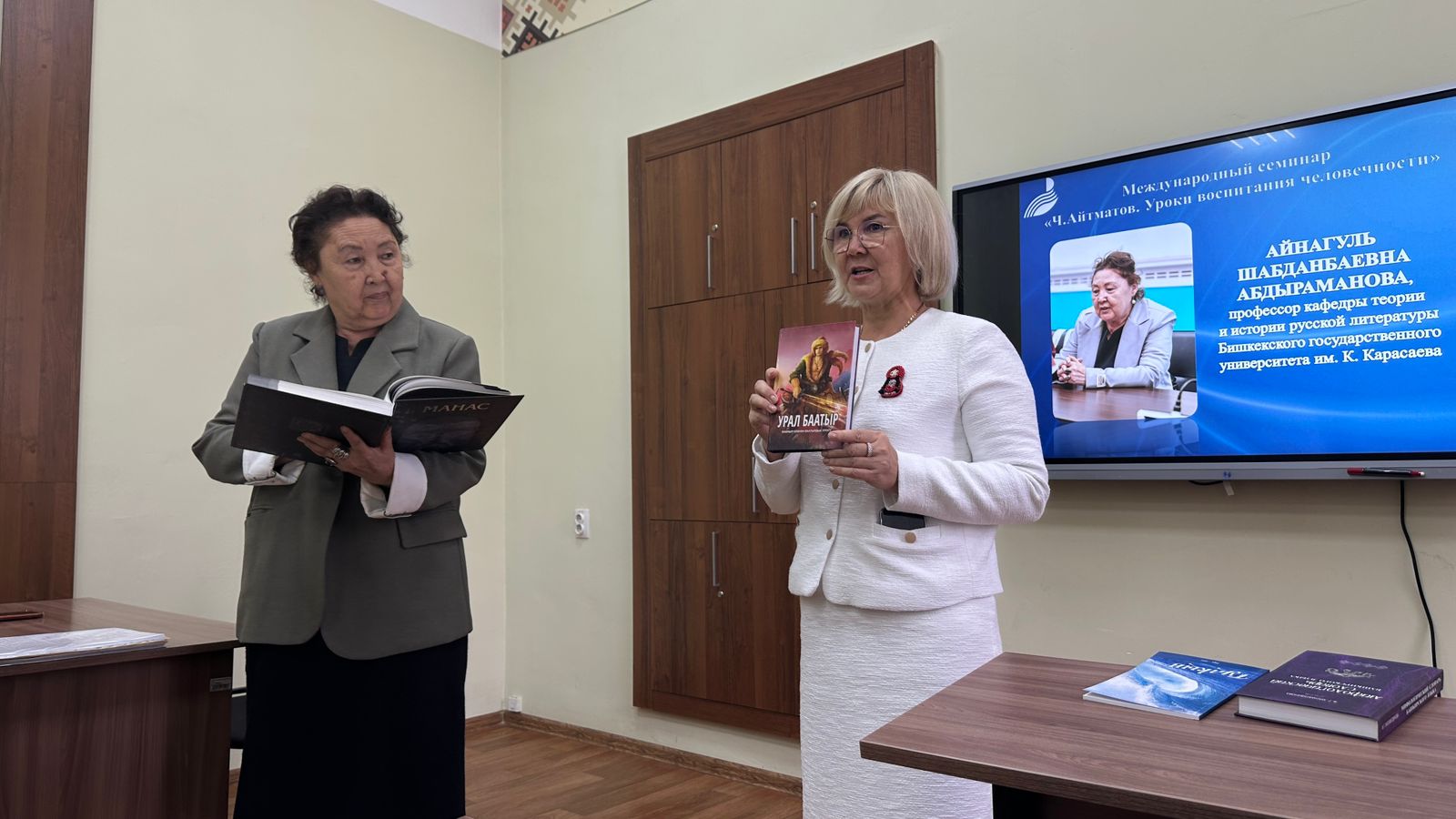 11 сентября 2025 года на факультете башкирской филологии состоялся Международный семинар "Ч. Айтматов. Уроки воспитания человечности". В рамках семинара состоялась выставка работ профессорско-преподавательского состава факультета, которую представили зав.кафедрой тюркской и восточной филологии Айтуган Юмабаевич и доцент кафедры башкирского языка и литературы Азалия Рафкатовна, а также студентам 5 курса прочитала лекцию профессор кафедры теории и истории русской литературы Бишкекского государственного университета им. К. Карасаева Айнагуль Шабданбаевна Абдыраманова. Айнагуль Шабданбаевна является одним из известных литераторов в области поэтики кыргызских романов 20 века, проблемы развития исторического романа в кыргызской литературе.