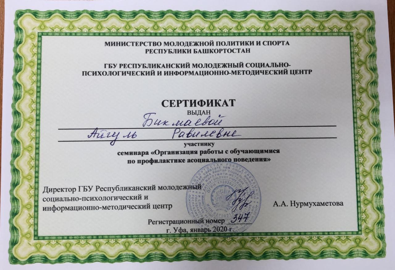 30 января 2020 г. в ГБУ Республиканский молодежный социальнопсихологический и информационно-методический центр г.Уфы прошел семинар для социальных педагогов образовательных учреждений: «Организация работы с обучающимися по профилактике асоциального поведения. Из опыта практической работы с молодежью». Колледж БГПУ им. М Акмуллы был представлен социальным педагогом  Бикмаевой Айгуль Равилевной. Слушателям семинара были предложены площадки следующего содержания: «Формы и методы работы с подростками, молодежью, родителями», «Профилактика асоциального поведения в молодежной среде». Для участников организована брифинг-зона: «Обсуждение. Обмен мнениями. Подведение итогов семинара».
