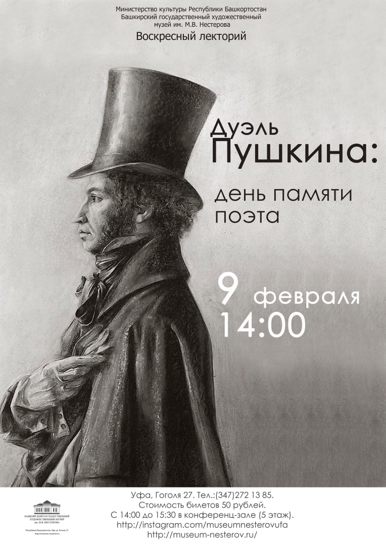 9 февраля  студенты  первого курса специальностей «Право и организация социального обеспечения» и «Документационное обеспечение управления и архивовоедение» (преподаватель русского языка и литературы  Крыжановская Ю.В.) прослушали лекцию «Дуэль Пушкина:  день памяти поэта» в  Башкирском государственном художественном  музее им. М.В.Нестерова. Из лекции, которую прочла сотрудник музея Вероника Александровна Боттичелли, студенты узнали много нового о последних днях великого русского  поэта.