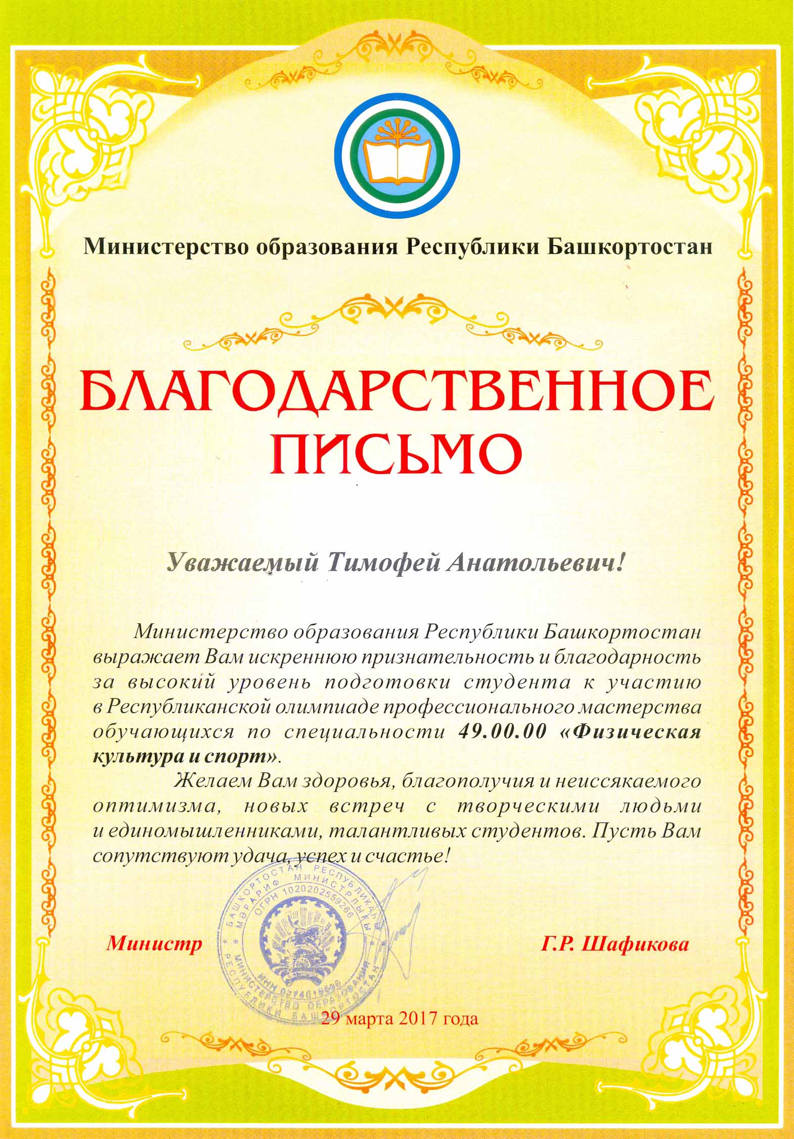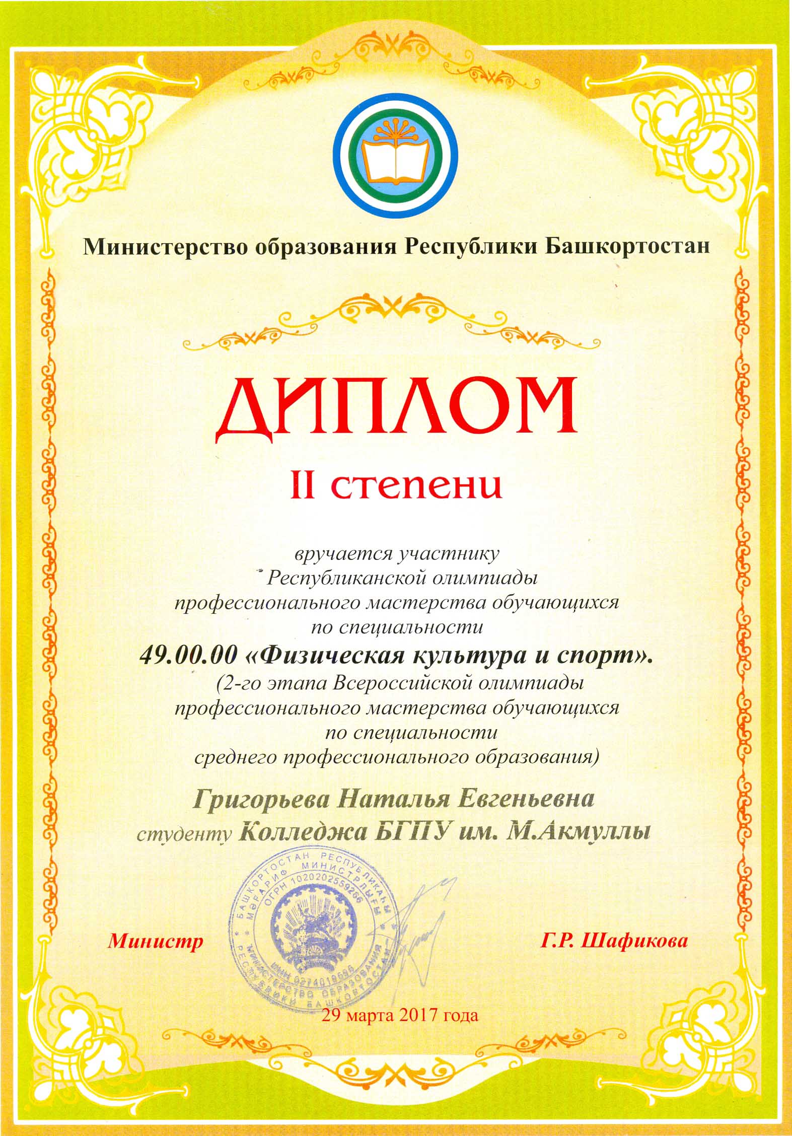 29 марта 2017 года на базе Стерлитамакского колледжа физической культуры, управления и сервиса проводилась Республиканская олимпиада профессионального мастерства обучающихся по специальностям среднего профессионального образования «Физическая культура», «Адаптивная физическая культура». Студентка Колледжа БГПУ им. М.Акмуллы Григорьева Наталья (группа 9ФК-31) стала обладательницей диплома II степени. Поздравляем и желаем дальнейших побед!