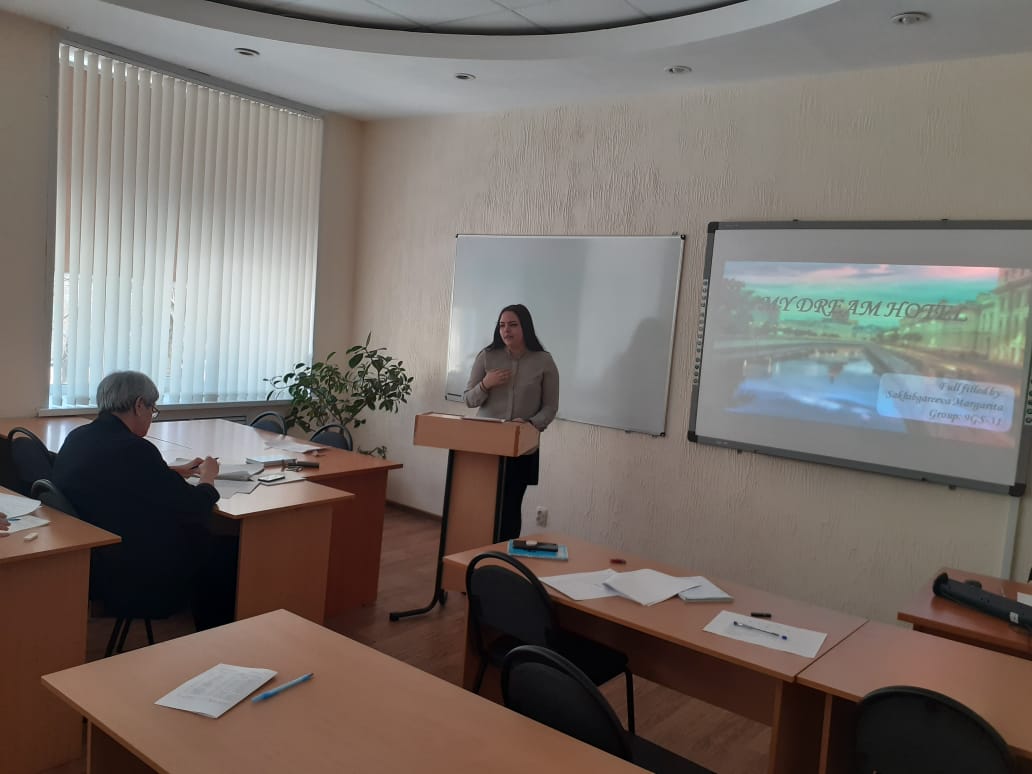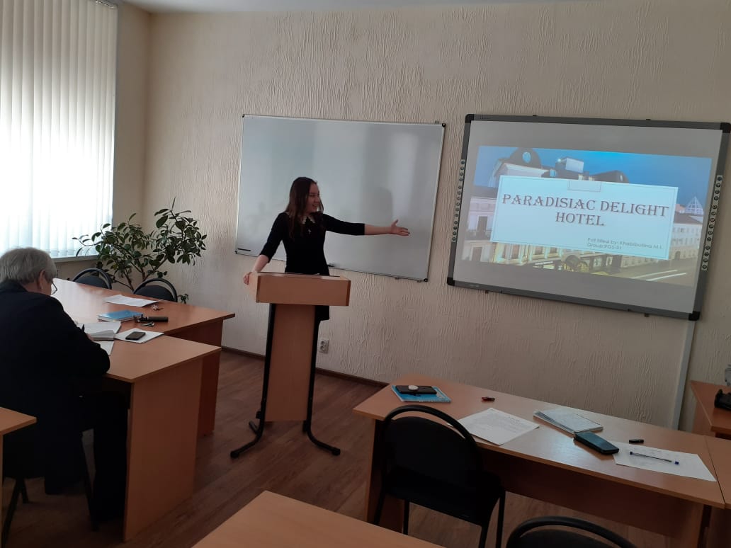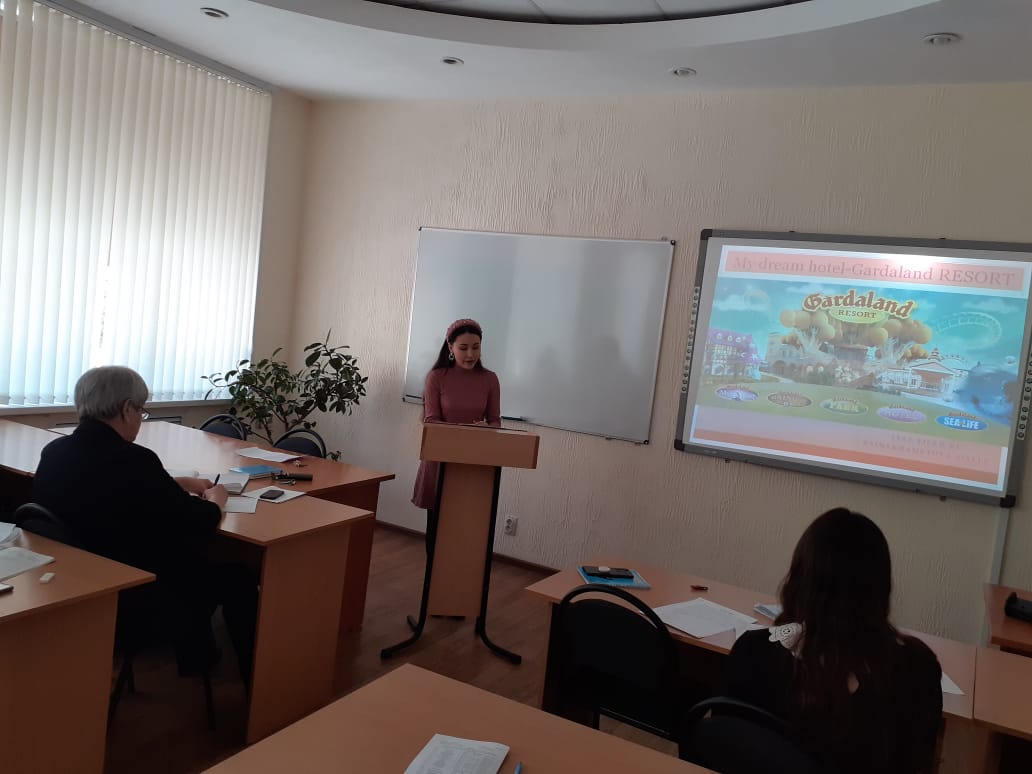 11 марта в рамках декадника цикловой специальности «Гостиничный  сервис» в выпускной  группе 9ГС-31-17(20) прошло открытое мероприятие - защита студенческих проектов «Гостиница будущего» или «Отель моей мечты» на английском языке. Студенты представили различные виды отелей, которые они хотели бы видеть в качестве своих собственных в будущем, начиная от гостиниц в крупнейших городах России - Санкт-Петербурге, Казани, Уфе и такими малыми, как гостиница в деревне Исяново Баймакского района РБ.Творческий подход к этому проекту продемонстрировали Малахова Ирина (гостиница Book House), Баймухаметова Айсылу (гостиница для семейного отдыха Gardaland Majectic).  Студенты сами оценивали себя, заполняя Control Cands и отвечая на вопросы одногруппников и преподавателя Хабибуллиной С.И. Лучшими стали  Азаматова Ильгина, Сахибгареева Рита, Хабибуллина Рита.