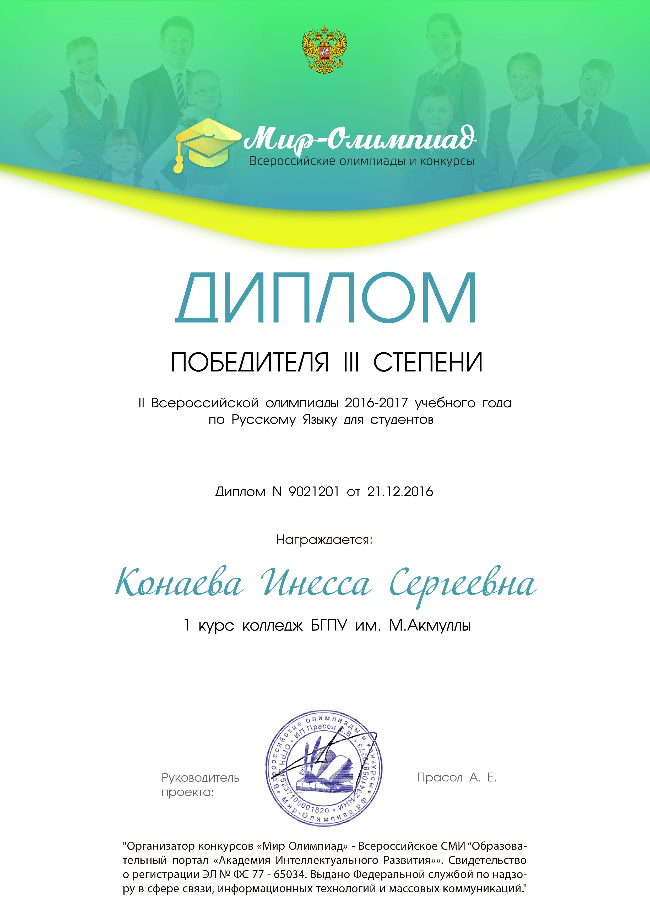 II Всероссийская олимпиада 2016-2017 учебного года по Русскому языку для студентов на сайте «Мир Олимпиад»: диплом II степени - Зинатуллина А., Сираева А. (гр.9Э-11); диплом III степени - Елисеева А., Харисова К., Заманова Г., Хайруллина И. (гр.9Э-11), Конаева И. (гр.9Т-11).