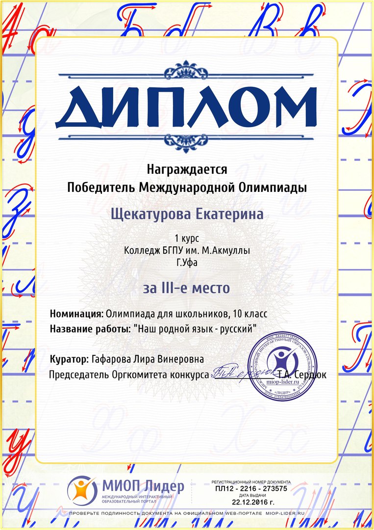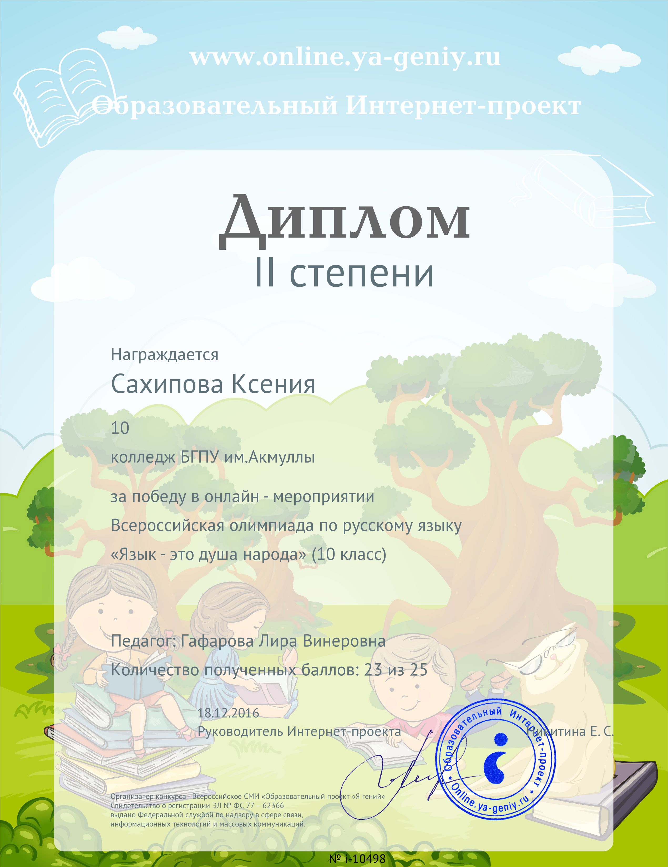 Всероссийская Олимпиада по Русскому языку  “Язык – это душа народа” для 10-го класса от Образовательного Интернет-проекта Ya-geniy.ru: диплом II степени - Сахипова К.(гр.9Т-11).