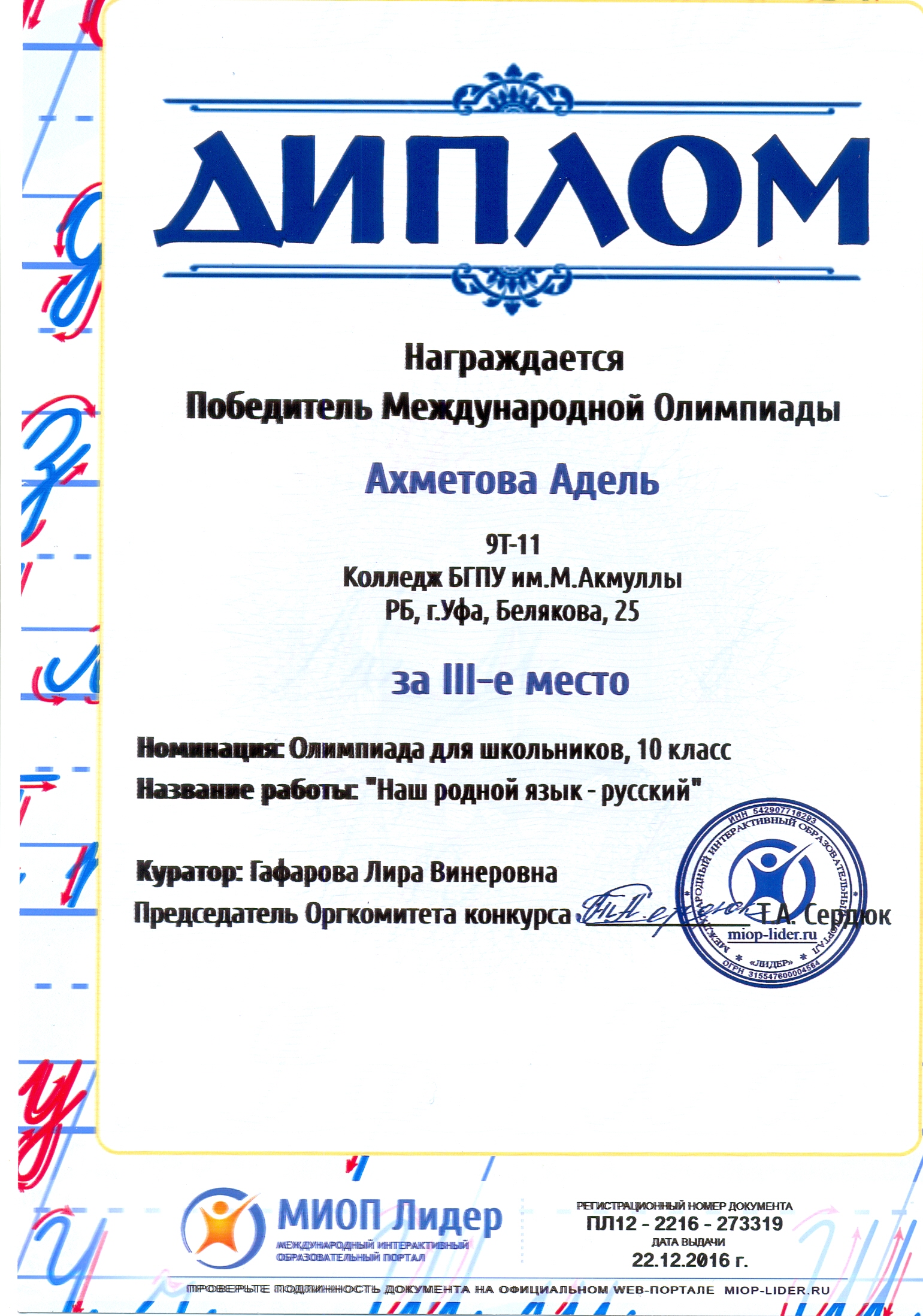 Всероссийская олимпиада для школьников по Русскому языку “Наш родной язык - Русский” на сайте МИОП Лидер: диплом I  степени - Абдурахманов С.(гр.9ПО-11), Гаязова Э., Шамсутдинова Э.(гр.9Т-11); диплом II степени - Галлямова И.(гр.9Т-11), Хакимов В.(гр.9ПО-11); диплом III степени - Щекатурова Е., Шарафутдинова А., Ахметова А.(гр.9Т-11); лауреат -Фартуков Д.(гр.9Т-11).