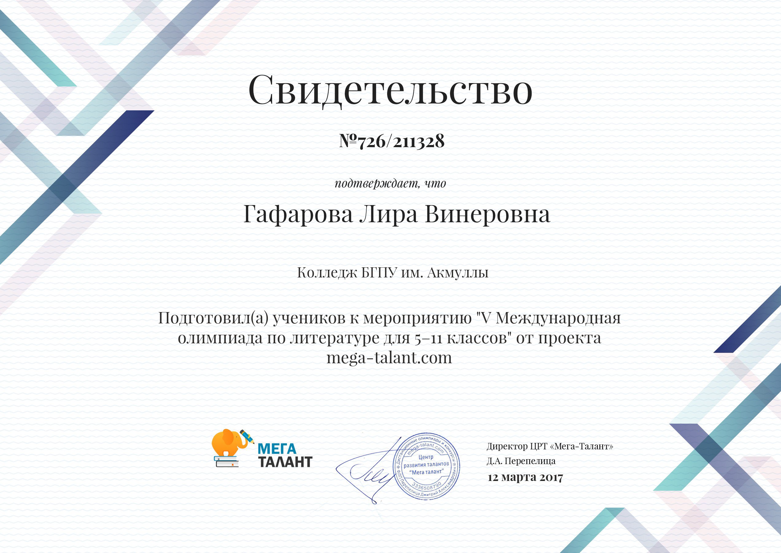 Поздравляем студентов Колледжа БГПУ им. М.Акмуллы (руководитель Л.В.Гафарова), принявших участие в конкурсах и олимпиадах: