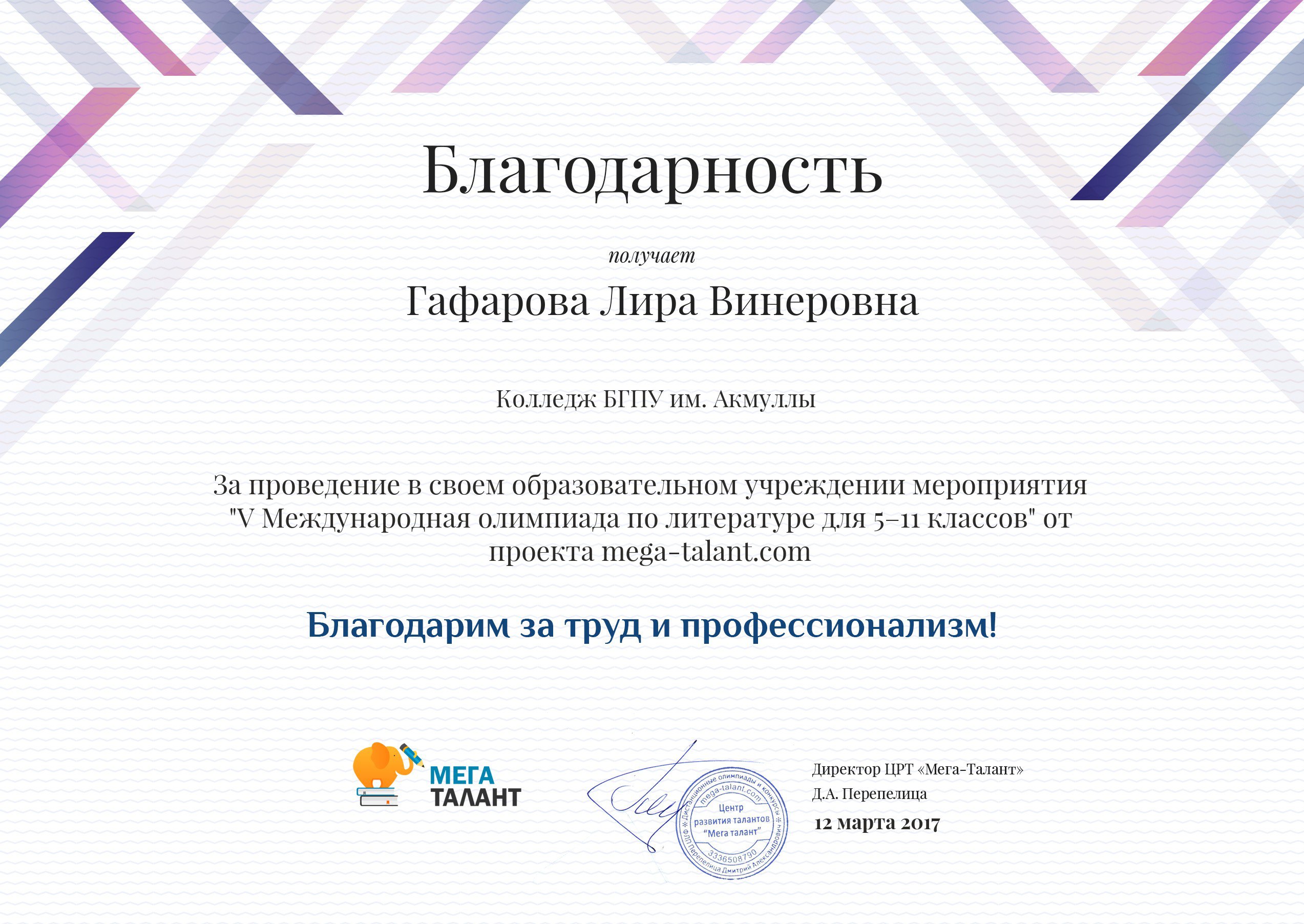 Всероссийская Олимпиада по Литературе для 5-11 классов от проекта mega-talant.com: диплом I степени  - Панцеховская А.(гр.9Т-11).