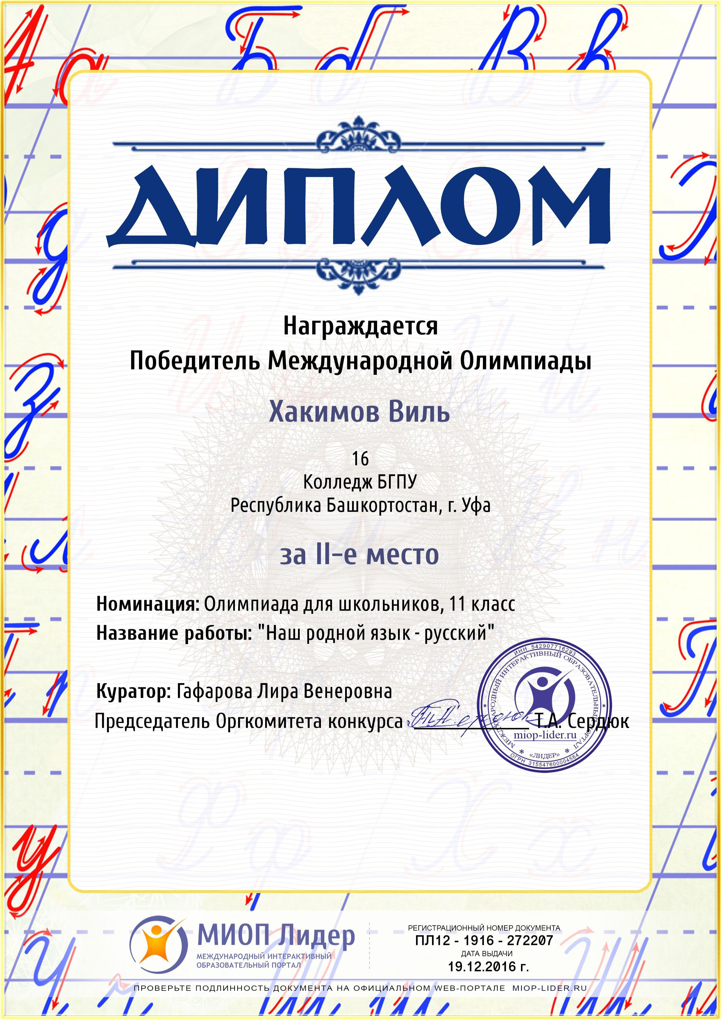 II Всероссийская Олимпиада по Русскому языку для 10-го класса от Центра дистанционных олимпиад и Творческих проектов ОЛИМП УСПЕХА: диплом I  степени - Мухамадеева Е., Еникеева В.(гр.9Б-11).