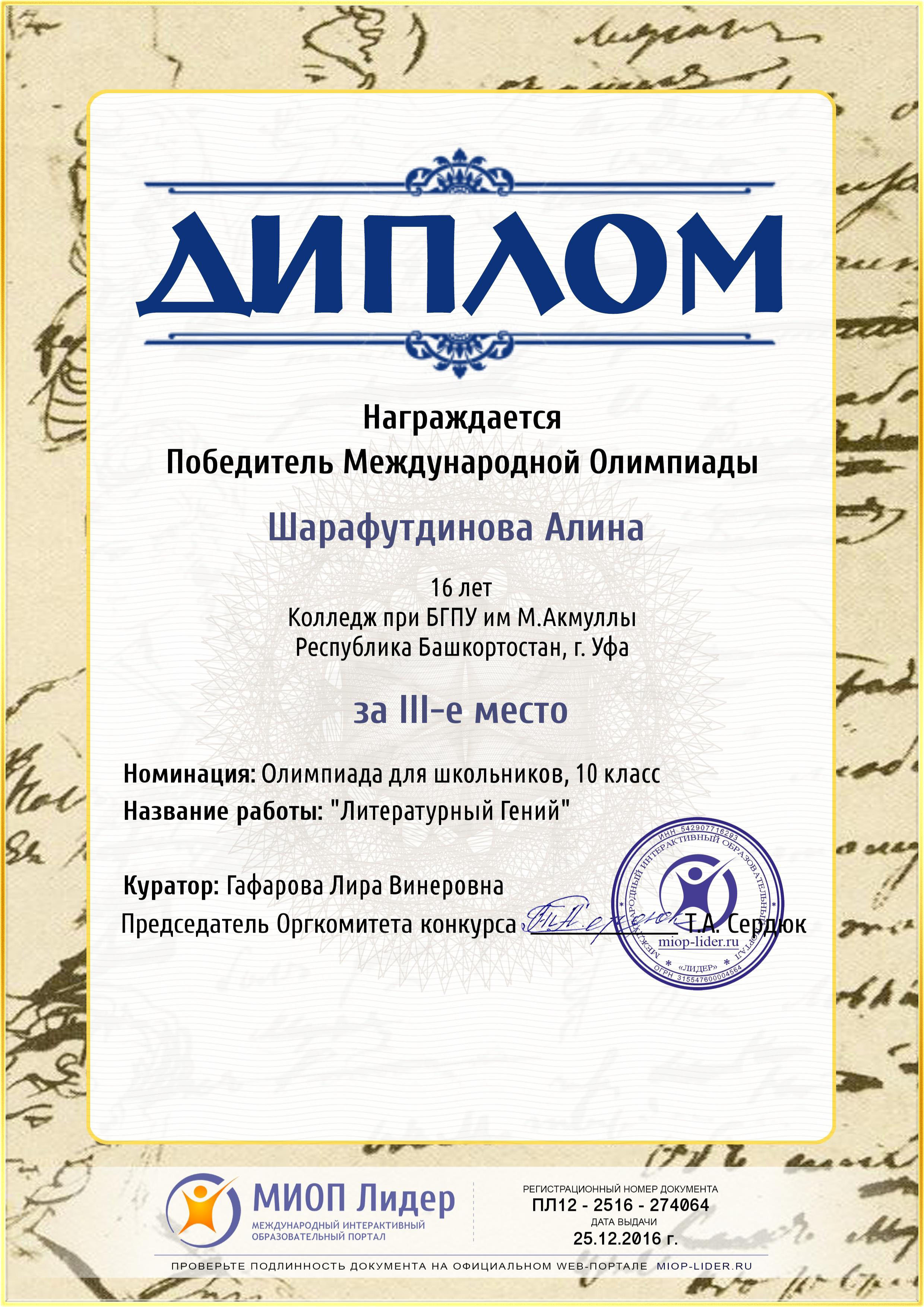 Всероссийская олимпиада для школьников по Литературе “Литературный гений” на сайте МИОП Лидер:диплом I степени - Шарафутдинова А.(гр.9Т-11).