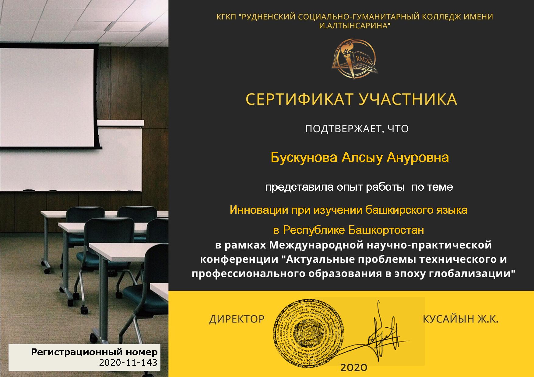 В октябре 2020 года состоялась Международная научно-практическая конференция «Актуальные проблемы развития профессионального образования в эпоху глобализации: история, опыт, практика», посвященная 80-летию КГКП «Рудненский социально-гуманитарный колледж им. И.Алтынсарина».  Целью конференции было:  исследование богатого духовного наследия основоположников  казахской педагогики, диссеминация педагогического опыта использования инновационных методов обучения молодежи на основе национальных ценностей, а  также обсуждение основных проблем подготовки конкурентноспособного специалиста.  Студенты специальности «Преподавание в начальных классах»  Колледжа БГПУ им. М.Акмуллы и их научные руководители, а также преподаватель башкирского языка Бускунова А.А. представили статьи, которые были включены в сборник конференции: Шишкина Яна (группа 9ПНК-11, преподаватель  Уелданова Н.А.)  - «Роль развивающих игр на уроках русского языка»; Сулейманова Аэлина (группа 9ПНК-31, преподаватель Низамова Р.Р.) - «Использование инновационных технологий в начальной школе»; Бускунова А.А. – «Инновации при изучении башкирского языка в Республике Башкортостан». Желаем им дальнейших  успехов в научной деятельности.