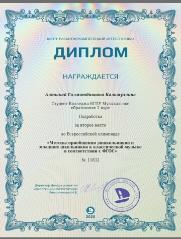 Студентка  Колледжа БГПУ им. М.Акмуллы специальности «Музыкальное образование» Калимуллина Алтынай  (группа 9МО-21-19(23)) приняла участие во Всероссийской олимпиаде «Методы приобщения дошкольников и младших школьников к классической музыке в соответствии с ФГОС», проводимой Центром развития компетенций «Аттестатика»,  и была награждена дипломом  за II место. Поздравляем с наградой и желаем дальнейших успехов!