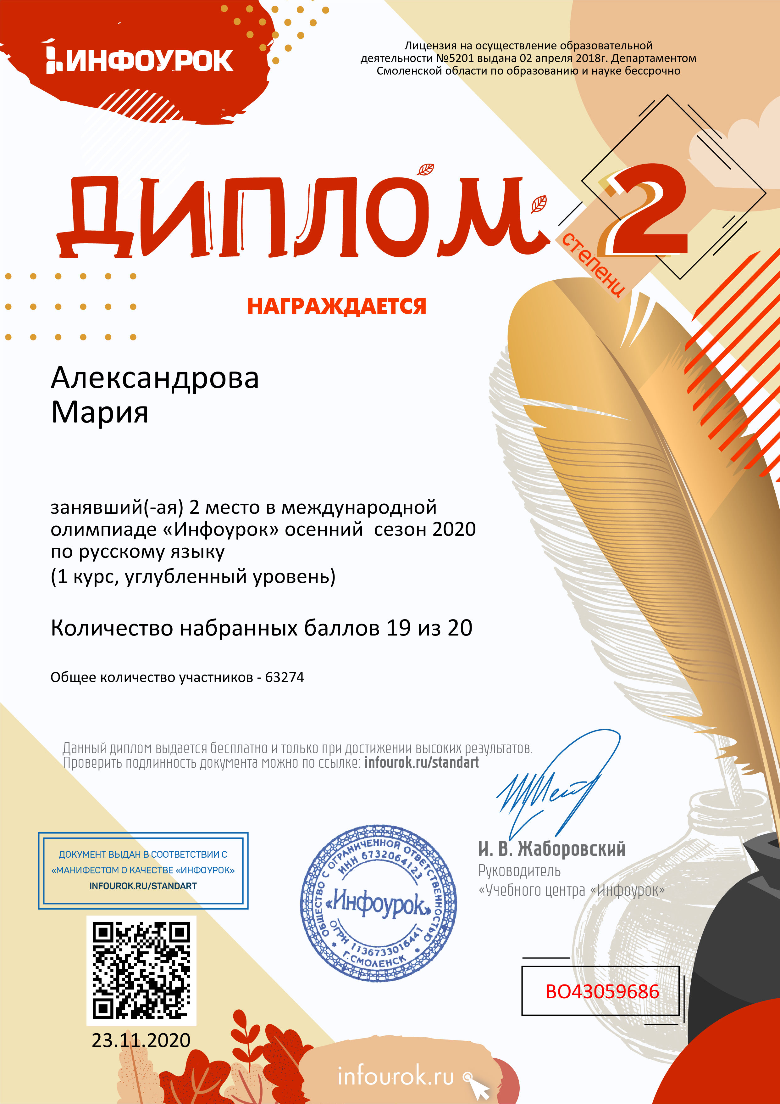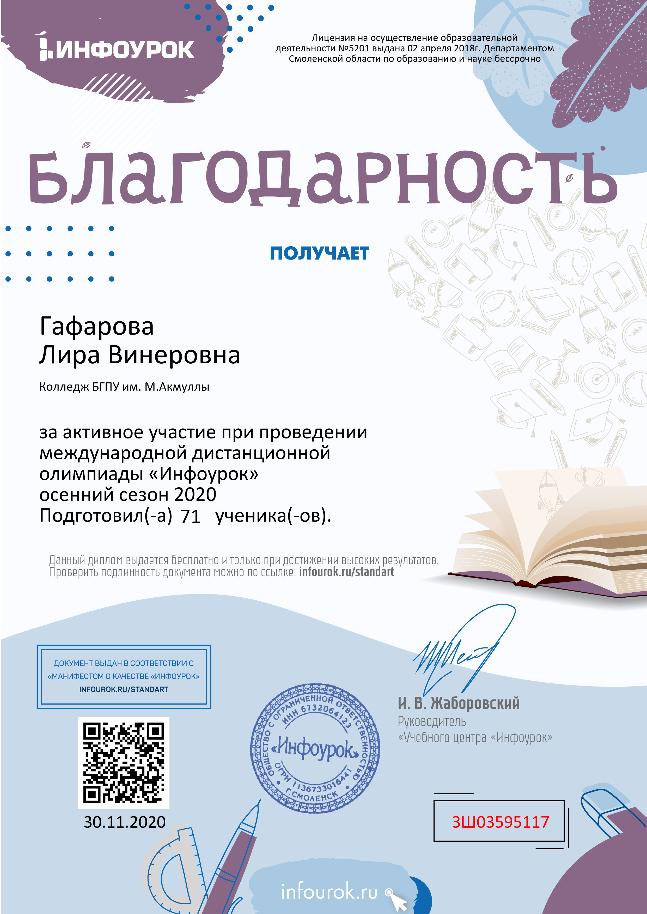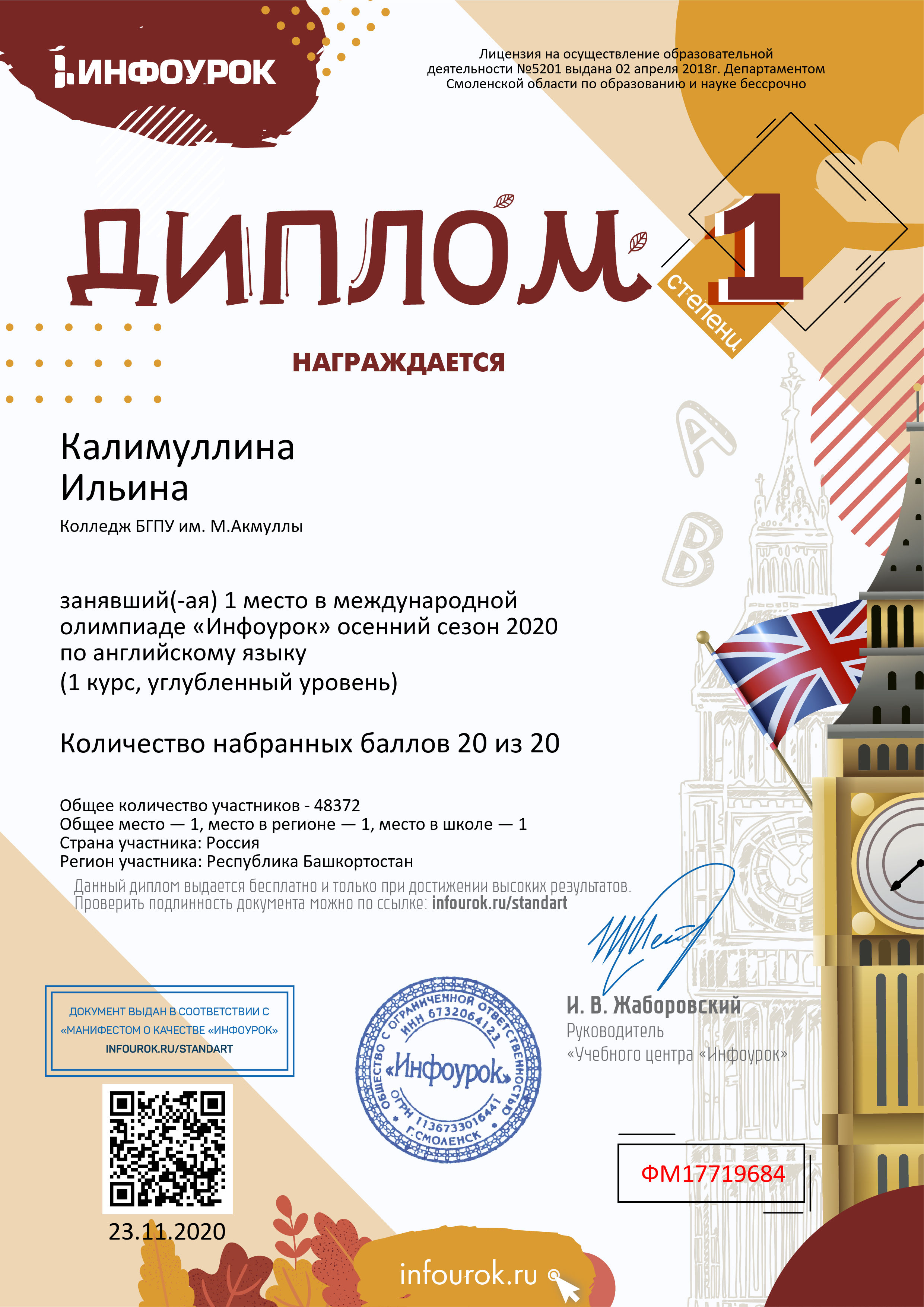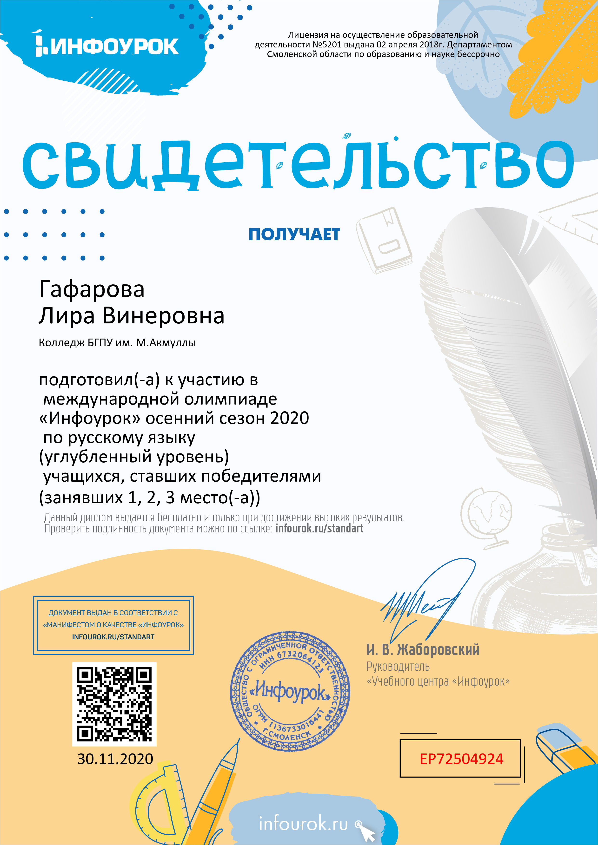 В ноябре 2020 года студенты Колледжа БГПУ им. М.Акмуллы приняли участие в бесплатной Международной олимпиаде «Инфоурок» по русскому и английскому языку. Олимпиада включала в себя задания углубленного уровня. Поздравляем студентов первого курса специальности «Туризм» (группа 9Т-11-20(23)), занявших призовые места, а также преподавателя английского языка Казыханову Н.И., преподавателя русского языка и литературы Гафарову Л.В.