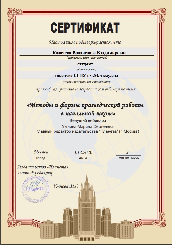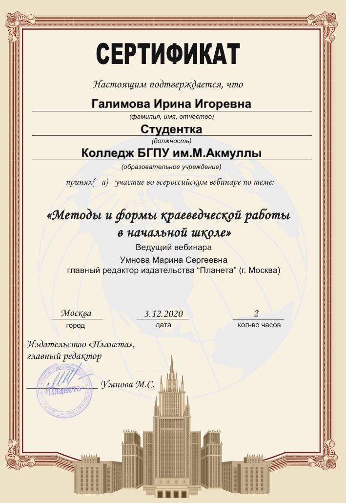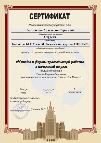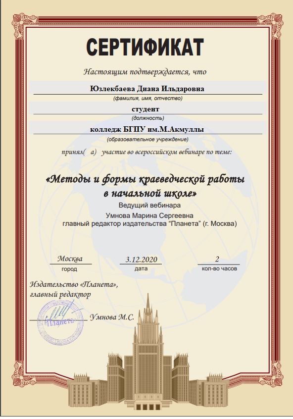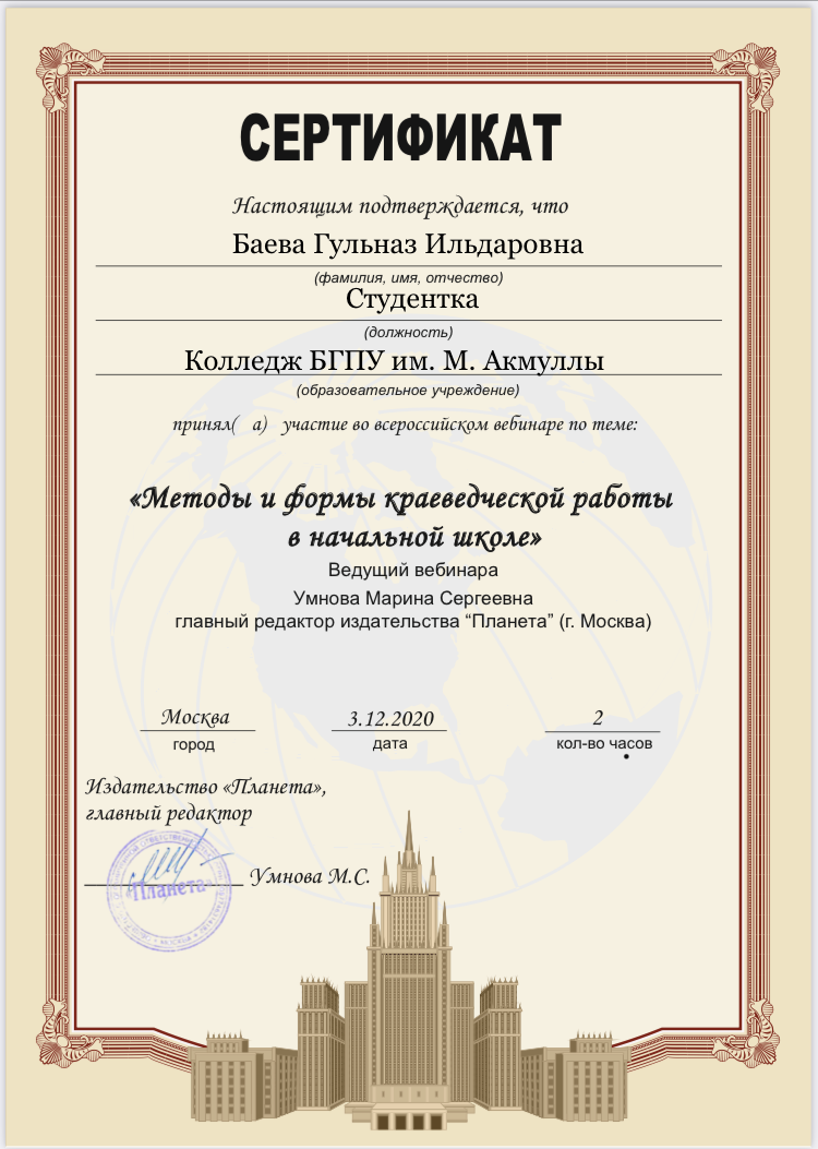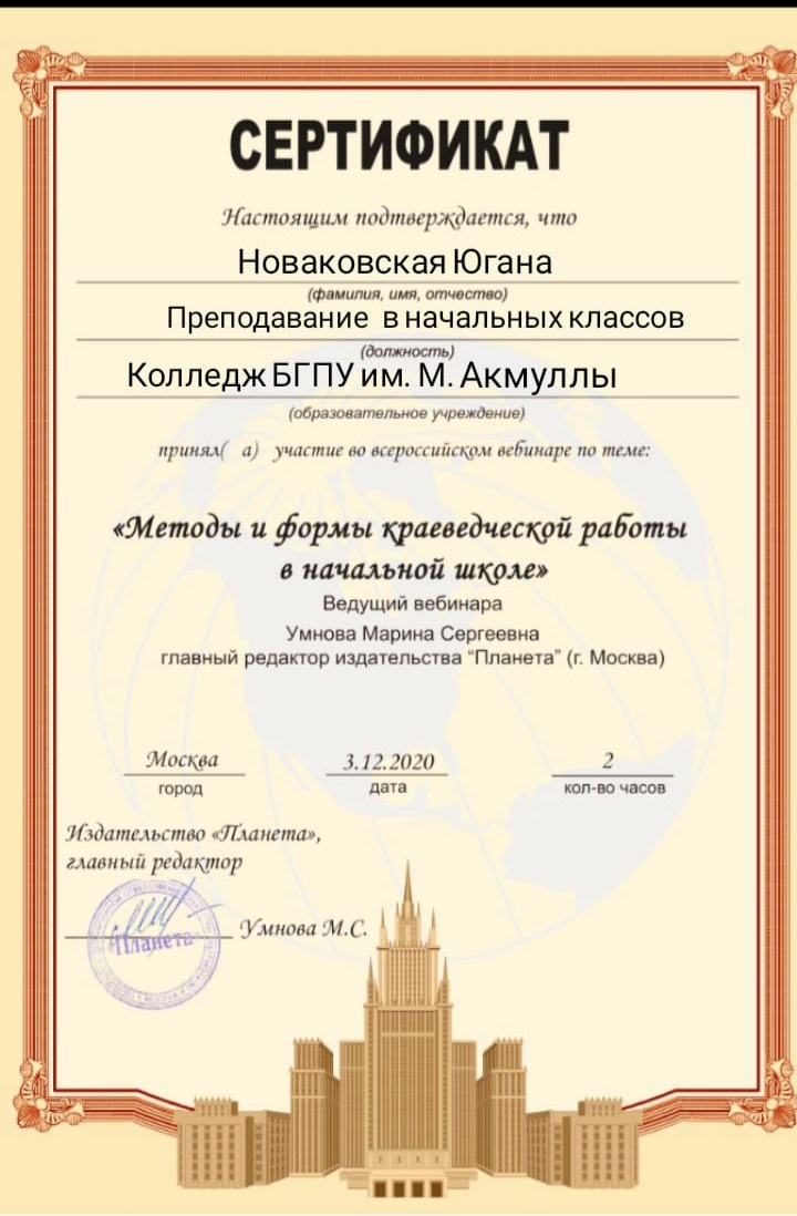 3 декабря 2020 г состоялся  вебинар  «Методы и формы краеведческой работы в начальной школе». Ведущий вебинара: Умнова Марина Сергеевна, главный редактор издательства «Планета». Мероприятие было организовано для учителей начальных классов, педагогов дополнительного образования, методистов. Студенты  специальности «Преподавание в начальных классах»  (групп 9ПНК-11, 9ПНК-12, 9ПНК-21, 9ПНК-31) Колледжа БГПУ им. М.Акмуллы  приняли участие в вебинаре и получили сертификаты.
