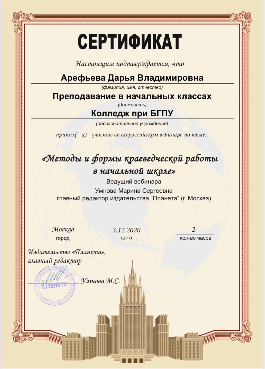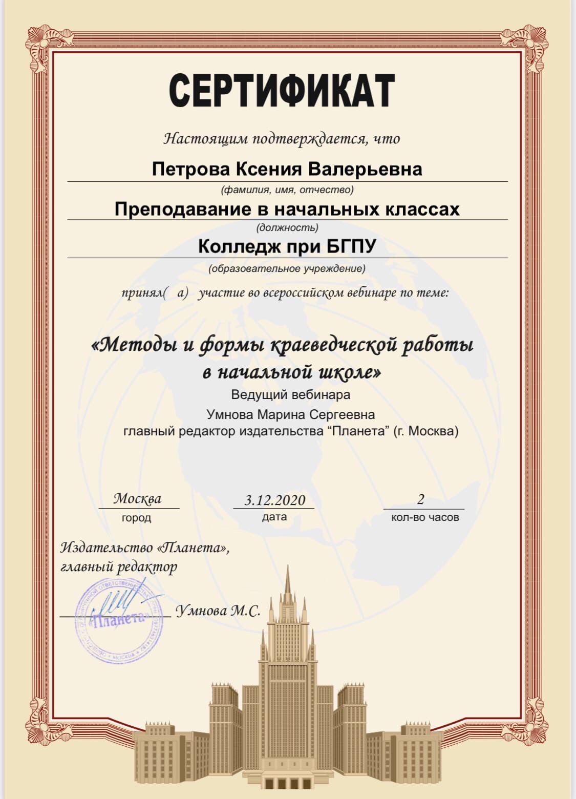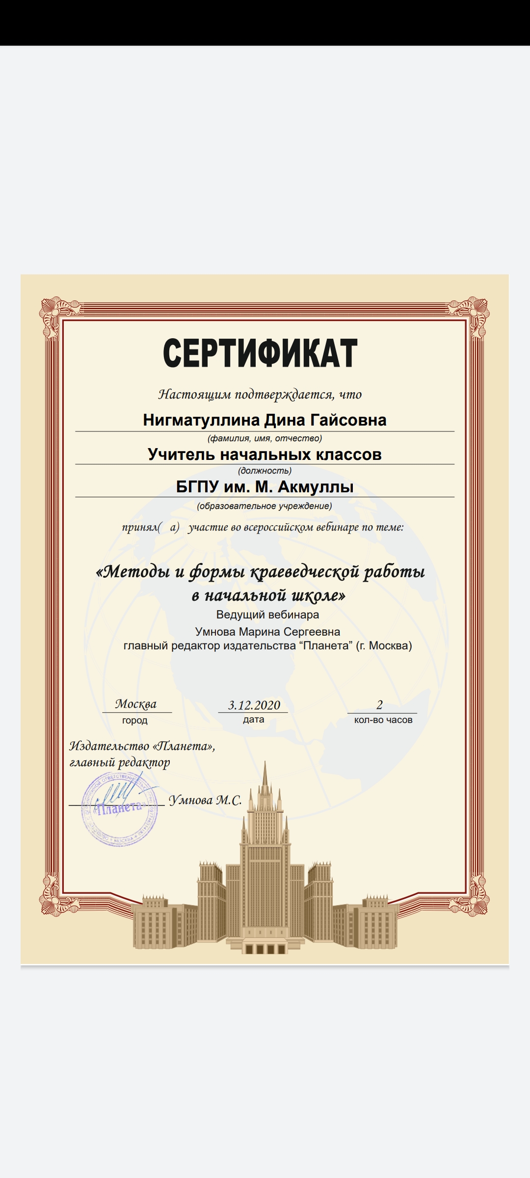 3 декабря 2020 г состоялся  вебинар  «Методы и формы краеведческой работы в начальной школе». Ведущий вебинара: Умнова Марина Сергеевна, главный редактор издательства «Планета». Мероприятие было организовано для учителей начальных классов, педагогов дополнительного образования, методистов. Студенты  специальности «Преподавание в начальных классах»  (групп 9ПНК-11, 9ПНК-12, 9ПНК-21, 9ПНК-31) Колледжа БГПУ им. М.Акмуллы  приняли участие в вебинаре и получили сертификаты.