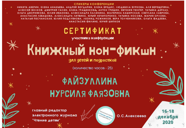 В декабре 2020 года студенты  групп  9Б-21-19(22),9Б-31-18(21) специальности «Библиотековедение» Колледжа БГПУ им. М.Акмуллы и методист Гафарова Л.В. приняли участие в онлайн-конференции "Книжный нон-фикшн для детей и подростков", которая была организована электронным журналом «Чтение детям»(http://www.readchildren.ru). Основными темами конференции были: