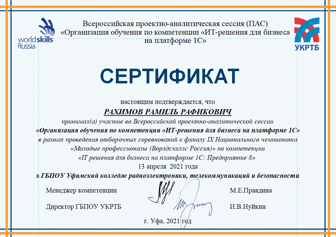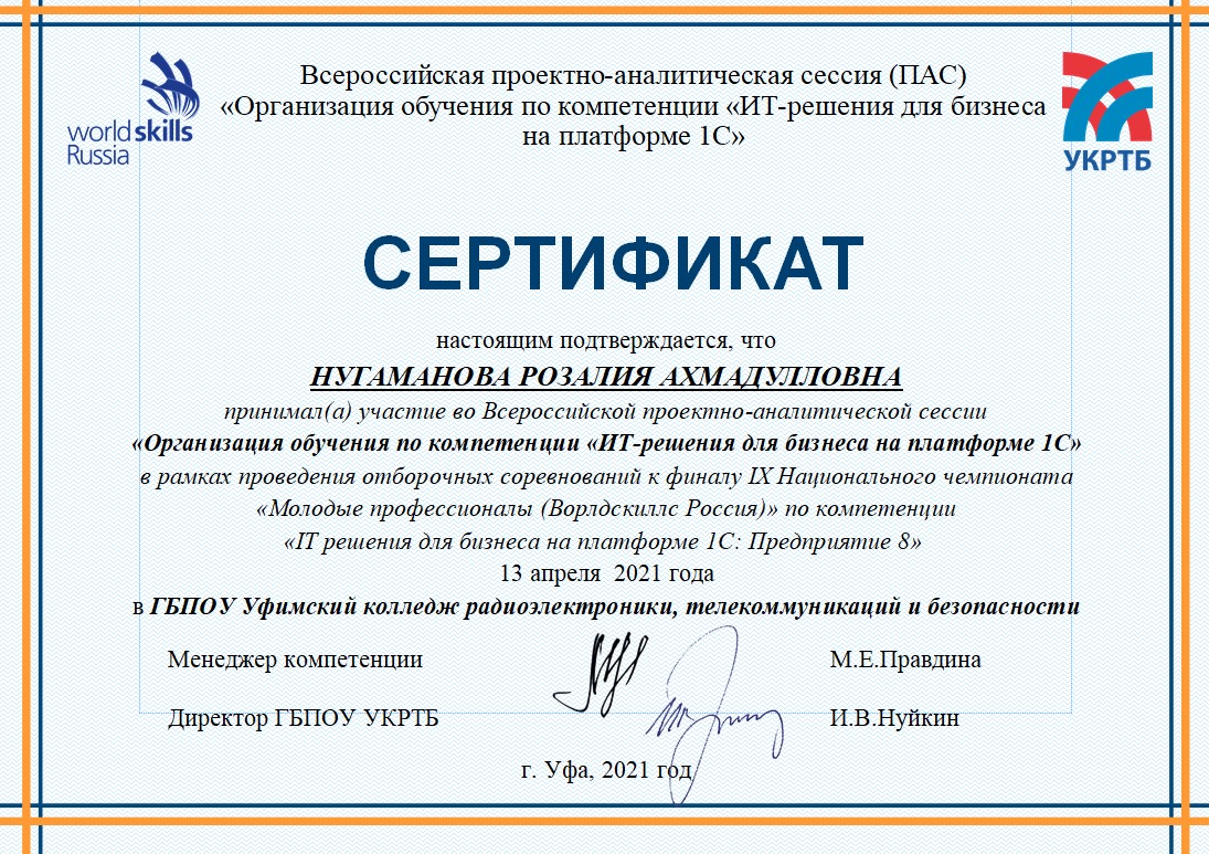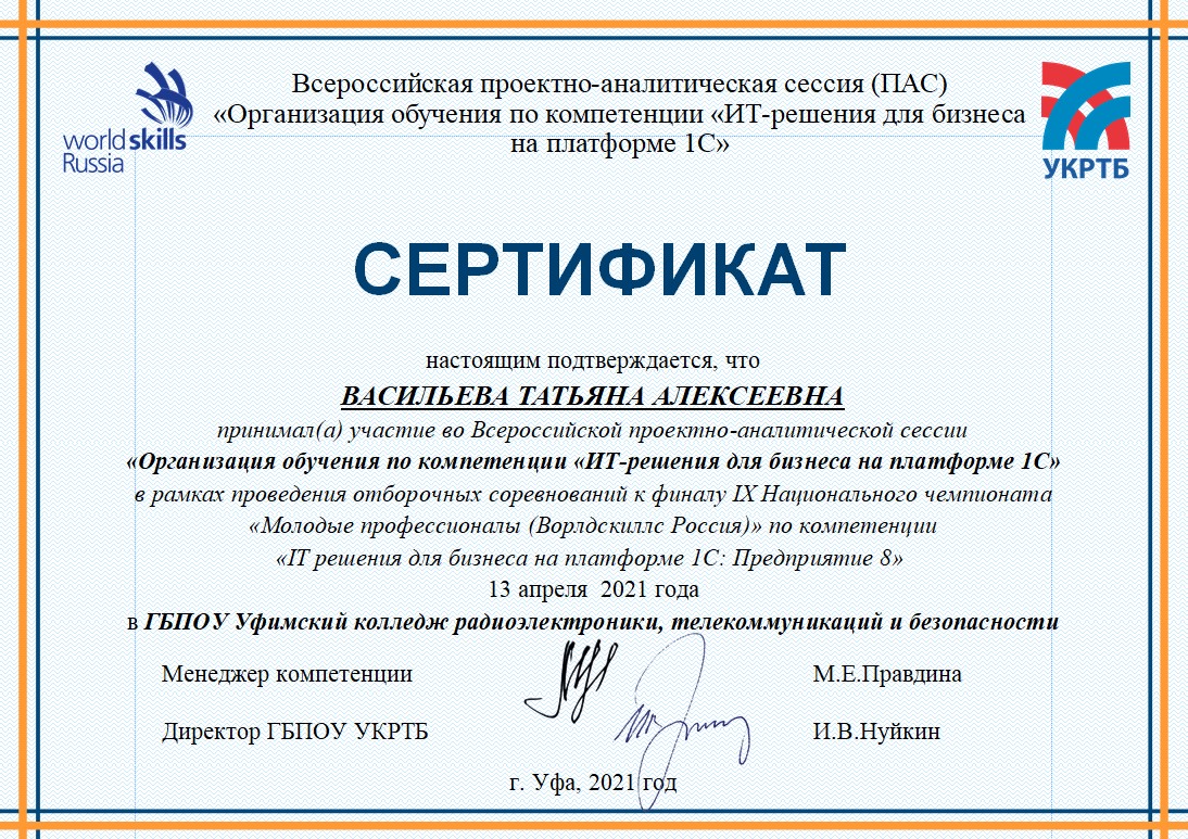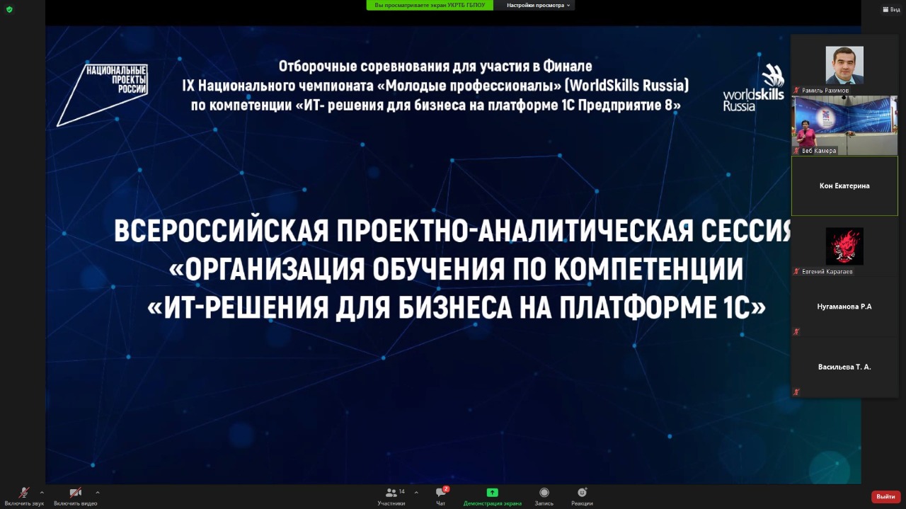 13 апреля 2021 г. на базе Уфимского колледжа радиоэлектроники, телекоммуникаций и безопасности в рамках проведения Отборочных соревнований для участия в Финале IX Национального чемпионата «Молодые профессионалы» (WorldSkills Russia) по компетенции «ИТ-решения для бизнеса на платформе 1С: Предприятие 8» в очно-дистанционном формате состоялась Всероссийская проектно-аналитическая сессия «Организация обучения по компетенции «ИТ-решения для бизнеса на платформе 1С».