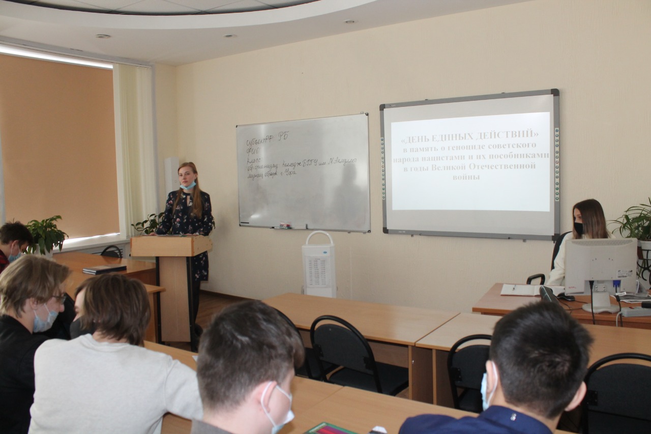 19 апреля 2021 года Колледже БГПУ им.М.Акмуллы принял участие во всероссийской акции «День единых действий», в память о геноциде советского народа нацистами и их пособниками в годы Великой Отечественной войны.