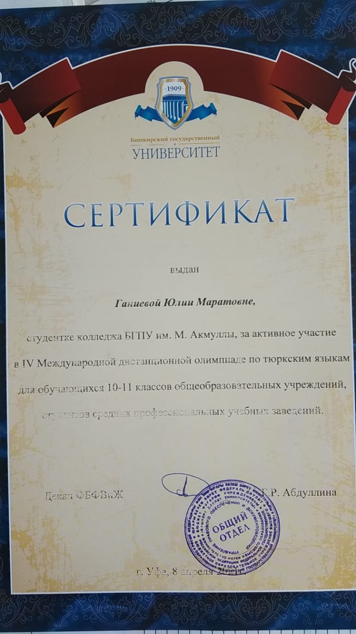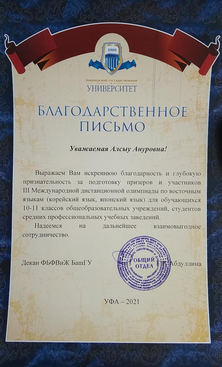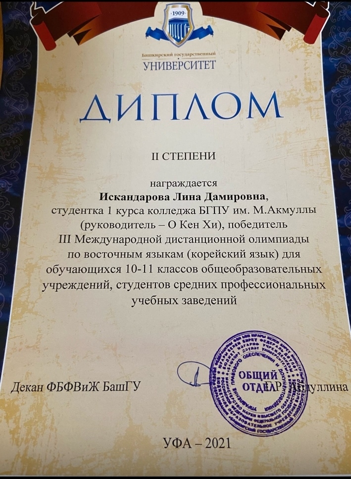 Поздравляем студентов Колледжа БГПУ им.М.Акмуллы, принявших участие в III Международной дистанционной олимпиаде по восточным языкам, которую провел Башкирский государственный университет для обучающихся 10-11 классов общеобразовательных учреждений, студентов средних профессиональных учебных заведений: Валиева Рузалина, группа 9ЗИО-21-19(22) – диплом II степени (корейский язык); Кобыляцкая Алена, группа 9ЗИО-21-19(22) – диплом II степени (японский язык), руководитель Бускунова А.А.; Искандарова Лина, группа 9ЗИО-11-20(23) - диплом II степени (корейский язык); Ганиева Юлия, группа 9ПСО-21-19(22) – сертификат участника. Желаем дальнейших успехов и побед!