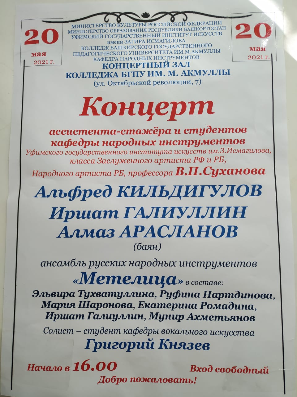 20 мая 2021 года студенты специальности «Музыкальное образование» Колледжа БГПУ им. М.Акмуллы посетили концерт кафедры народных инструментов Уфимского государственного института искусств им.З.Исмагилова, класса Заслуженного артиста РФ и РБ, Народного артиста РБ, профессора В.П. Суханова.
