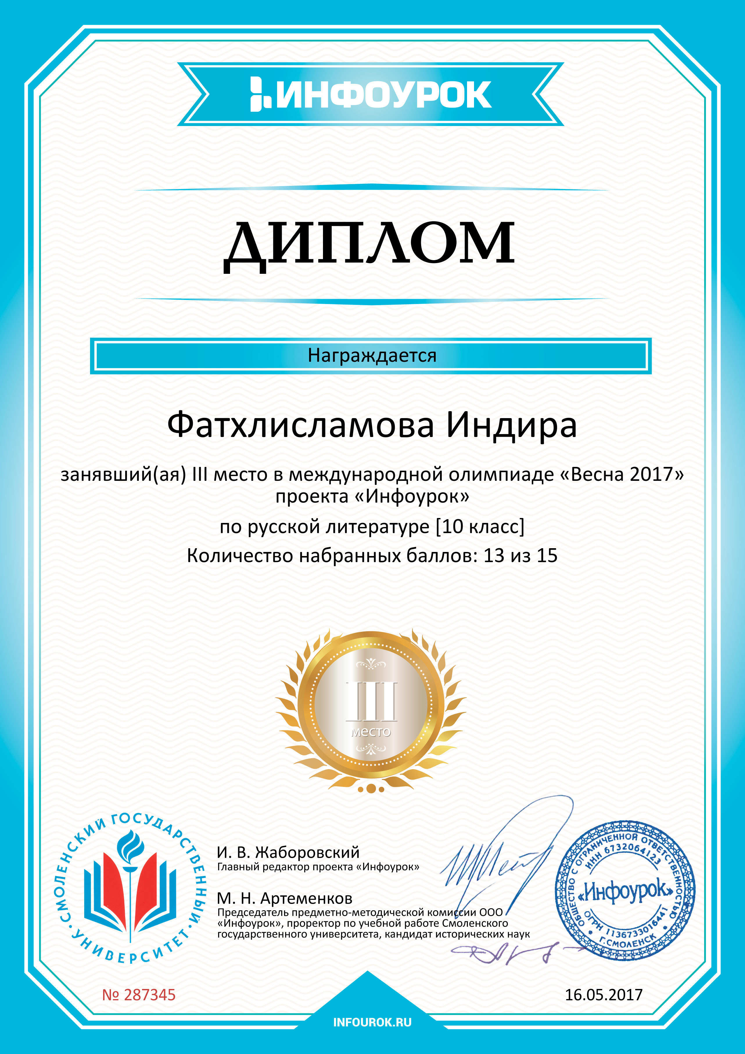 Международная Олимпиада по Русской литературе от проекта «Инфоурок»: диплом I степени – Зыкова Е. (гр.9Б-11); Гимадиева А., Шайхиева Л. (гр.9ПО-11); диплом II степени – Еникеева В., Мухамадеева Е. (гр.9Б-11); Щекатурова Е., Шарафутдинова А., Фабарисова Н., Абдулов И., Абдрахманова Я., Зилеева А., Конаева И., Нестерова А., Сахипова К. (гр.9Т-11); Музафаров Д. (гр.9ПО-11); диплом III степени – Хисамова Э. (гр.9Б-11); Красноборова Д., Пантюхина О., Усков А., Фатхлисламова И.(гр.9ПО-11); Ахметова А., Беседин Р., Исянбаева А., Катриш В., Муратова Э., Сулейманова А. (гр.9Т-11).