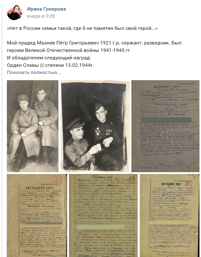 Предлагается разместить короткое видео человека с портретом своего ветерана, который  рассказывает  о подвиге героя и говорит, что не допустит осквернения его памяти.