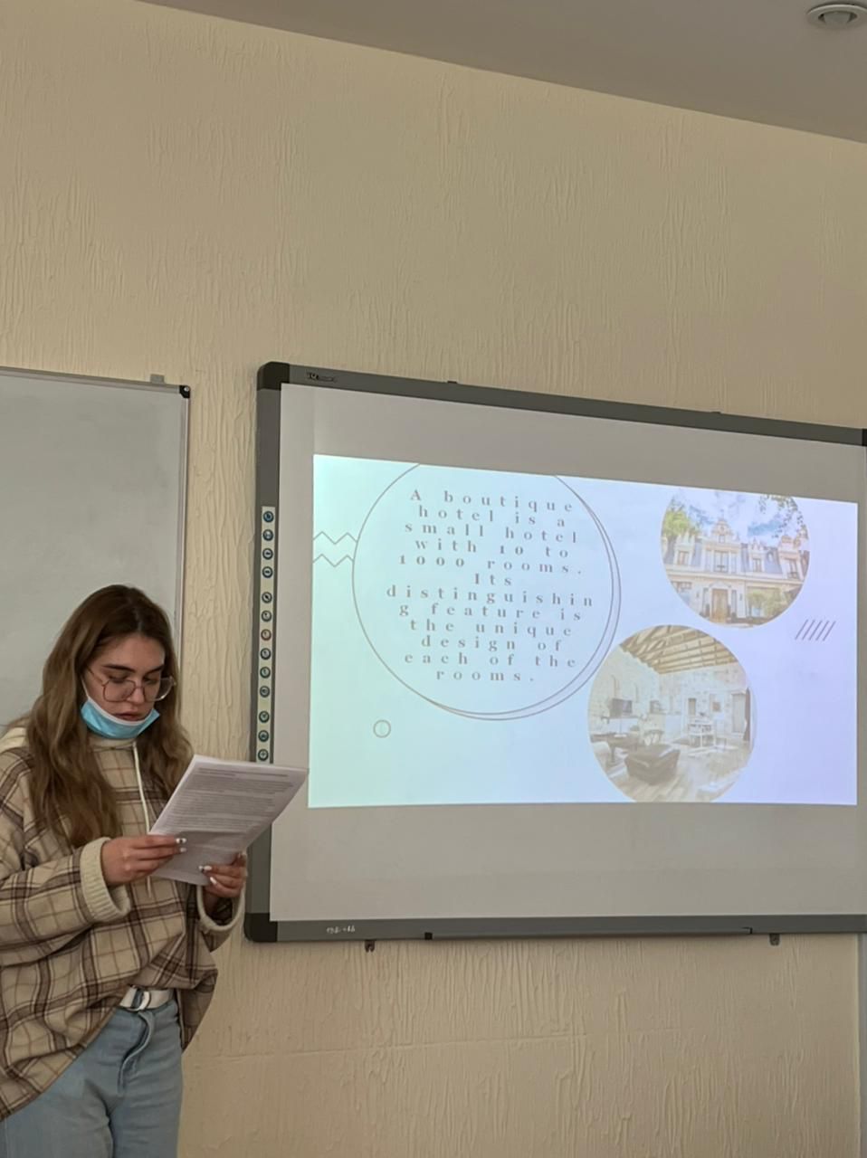 В рамках декадника специальности 43.02.11 Гостиничный сервис 3 марта 2022 года в группе 9 ГС21 прошла открытая Защита студенческих проектов “Hotel Types”. Защита проектов завершает первый раздел изучения профессиональной лексики по дисциплине «Английский язык в сфере профессиональной  деятельности». Благодарными слушателями и экспертами оценки выступлений студентов стали преподавательиностранного языка С.И.Хабибуллина и студенты других групп. Учитывались следующие критерии: культура речи, знание английского языка, креативность презентаций, ответы на вопросы. Вниманию зрителей были представлены презентации таких видов отелей, как B&B, Boutique Hotels, Flytels, Ski Resort Hotels, Flotels, Rotels, Glampings. Подробно рассказала об основных и дополнительных услугах отелей Boutique Смакова Софья, о преимуществах и  недостатках Flotels-Мингазова Азалия. Интересными были проекты Нигмадьяновой Дианы и Хасановой Миляуши (Rotels and Glamping). Защита проектов завершилась подробным анализом представленных проектов и предложениями по их совершенствованию.
