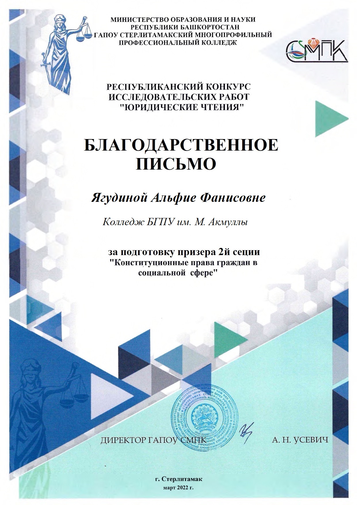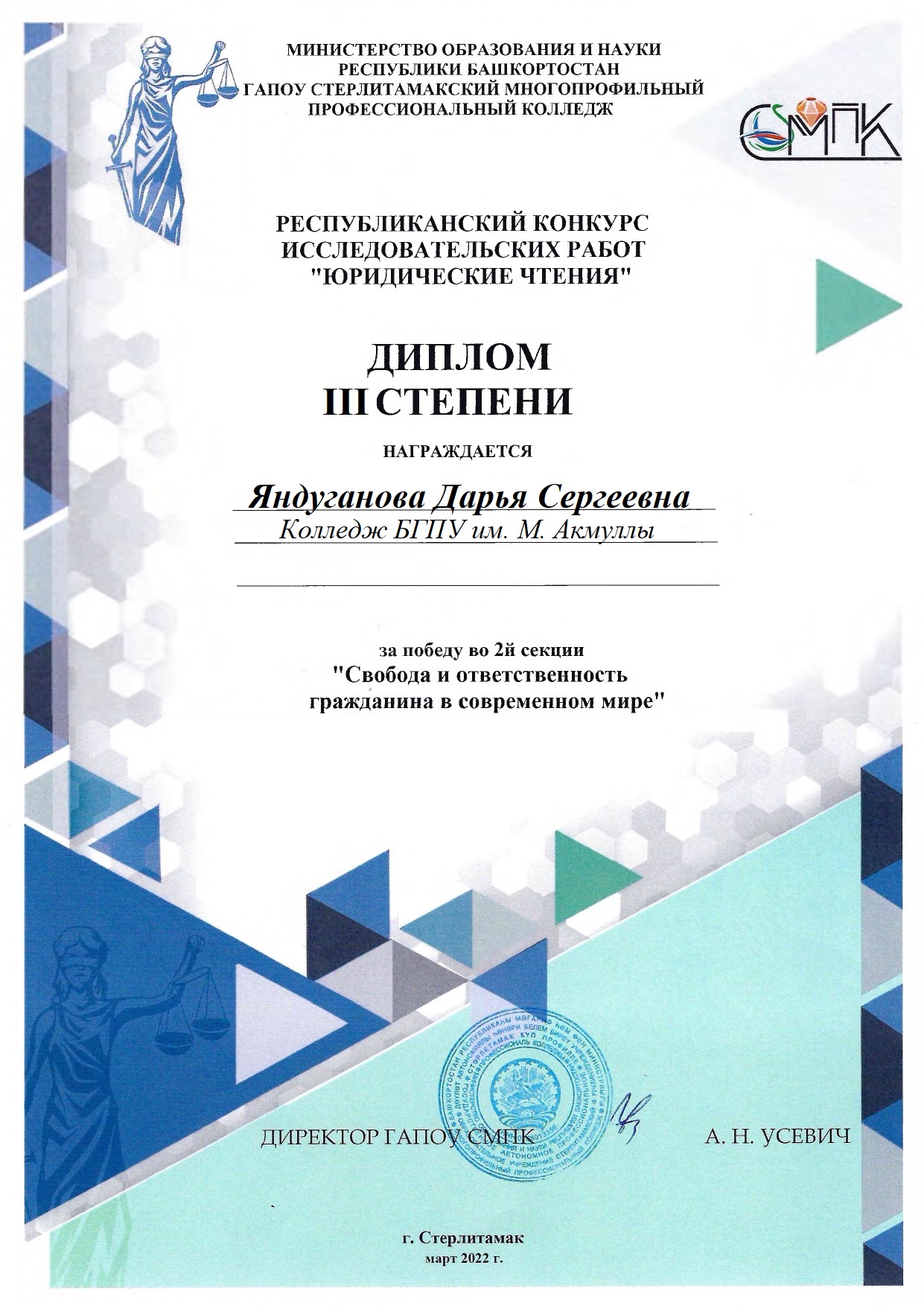 17 марта 2022 года на базе Стерлитамакского многопрофильного профессионального колледжа был проведен Республиканский конкурс исследовательских работ "Юридические чтения". Студентка группы 9ПСО-31 Яндуганова Д.С. (руководитель Ягудина А.Ф.) приняла участие и заняла 3 место в секции «Свобода и ответственность гражданина в современном мире».