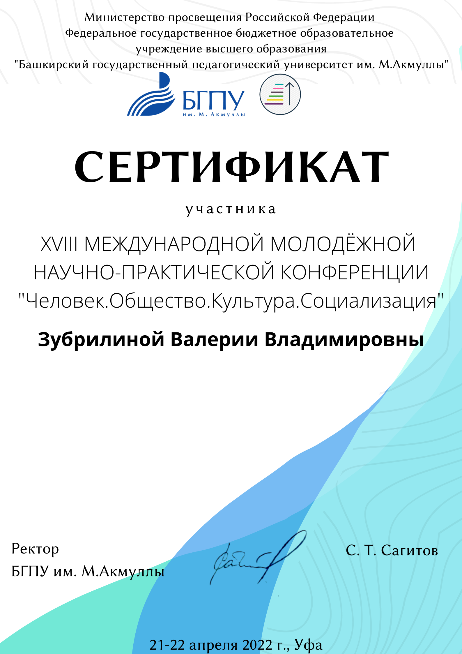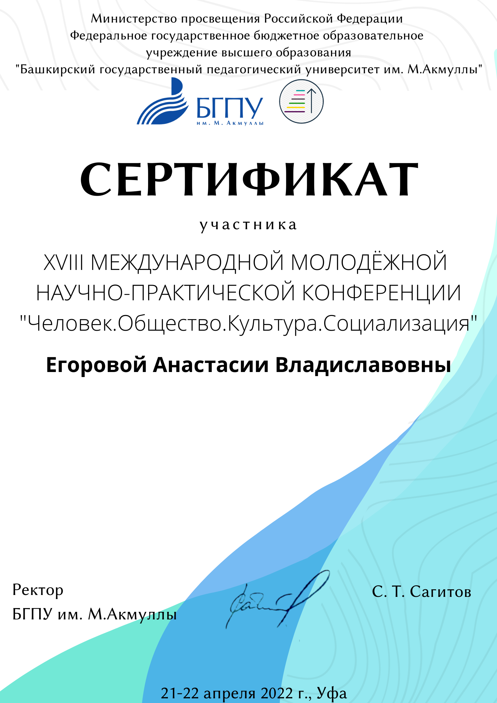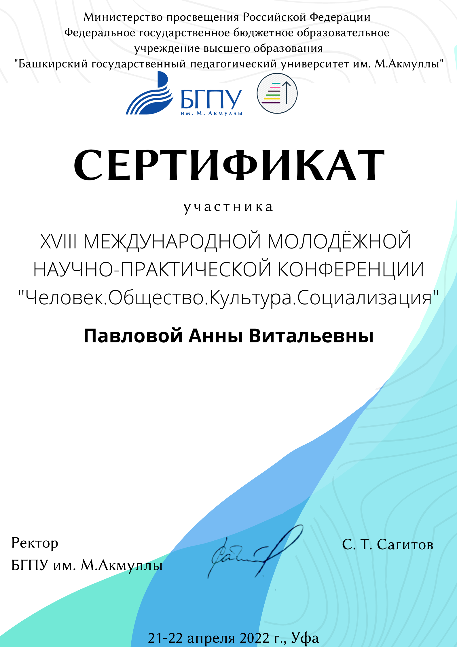 21-22 апреля 2022 года в Уфе прошла XVIII Международная молодежная научно-практическая конференция «Человек. Общество. Культура. Социализация», посвященная 55-летию Башкирского государственного педагогического университета им. М. Акмуллы. Мероприятие состоялось на базе Института исторического, правового и социально-гуманитарного образования университета и проходило в рамках Евразийского молодёжного форума «Образование. Наука. Карьера».