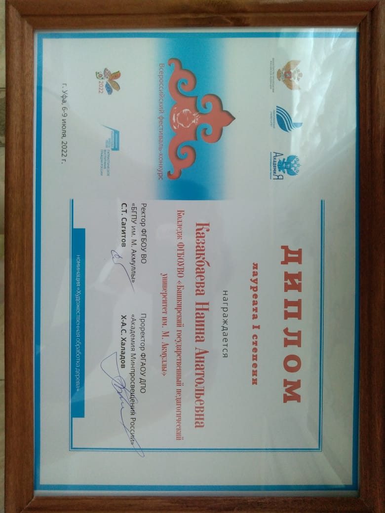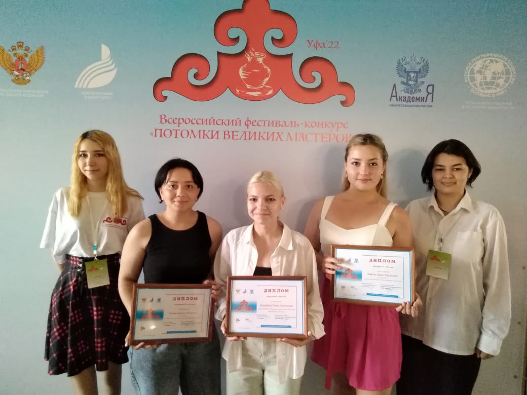 В нем приняли участие студенты нашего  Колледжа специальностей   «Изобразительное искусство и черчение» и «Преподавание в начальных классах». То, что ребята прошли заочный отборочный этап и попали в финал – уже большое достижение. Но и вовремя финальных, очного этапа, в котором было два конкурсных испытания – защита своего проекта и выполнение задания, полученные от экспертов фестиваля-конкурса, студенты колледжа не подкачали. У нас замечательные результаты:- все участники, а это: Агаджанива Лейсан, группа 9ИЗО-31-19(23), Валитова Гульназ, группа 9ИЗО-41-18(22), руководитель Агишева Лиза Рафиковна, Бутко Валерия, группа 9ИЗО-21-20(24), руководитель Садыкова Регина Римовна, получили сертификаты участников финала, а Казакбаева Наина группа 9ИЗО-21-20(24), руководитель Козлова Галина Владимировна – Диплом Лауреата 1 степени, в номинации «Художественная обработка дерева» Каримова Дарина, группа 9ПНК-11-21(25),руководитель Валеева Эльвира Ангамовна – Диплом Лауреата 1 степени в номинации бисероплетение и вышивка бисером», Безгина Вероника, группа 9ИЗО-19(23), круководитель Козлова Галина Владимировна – Диплом Лауреата 2 степени в номинации «Художественная роспись по ткани».