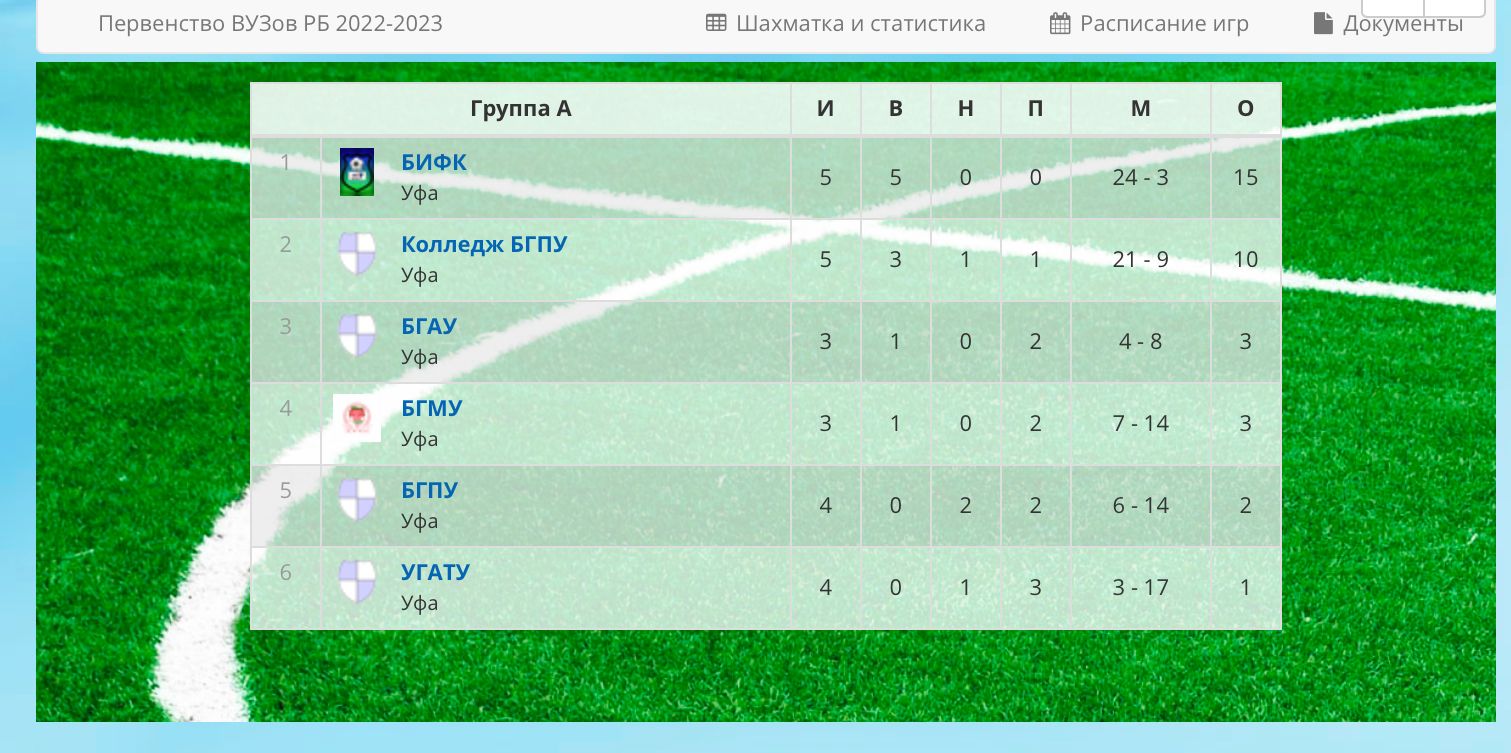 Завершился первый круг чемпионата Республики Башкортостан РФСЛ среди вузов по футболу. Колледж БГПУ им.М.Акмуллы сыграл со счетом 10:1 против УГАТУ. Тем самым наши ребята закончили его на второй позиции,и после зимы во втором круге попытаются приложить все усилия,чтобы стать чемпионами турнира.
