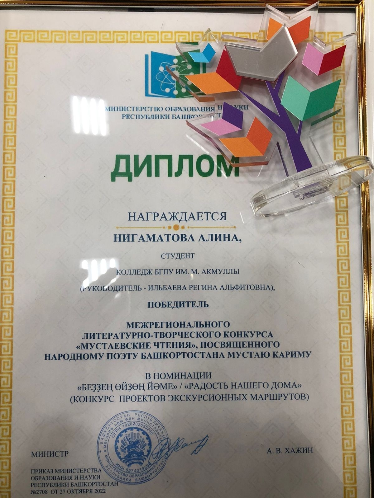 С 10 по 24 октября 2022 года был проведен Межрегиональный литературно-творческий конкурс «Мустаевские чтения», посвященный Народному поэту Республики Башкортостан Мустаю Кариму. В Конкурсе приняли участие 7147 обучающихся, учителей общеобразовательных организаций, студентов профессиональных образовательных организаций, образовательных организаций высшего образования. Нигаматова Алина, студентка группы 9МО-11 стала победителем в номинации «Беҙҙең өйҙөң йәме» /«Радость нашего дома» - конкурс проектов экскурсионных маршрутов. От всего сердца поздравляем и желаем в дальнейшем успехов и новых побед!