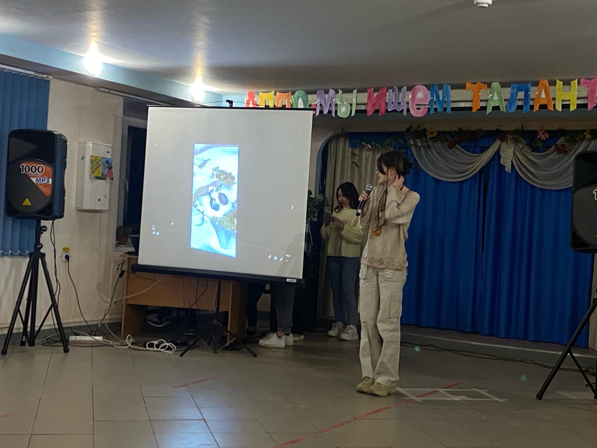 Сценарий мероприятия был построен с использованием проектора, чтобы студенты демонстрировали свои грамоты, дипломы, видеосюжеты.