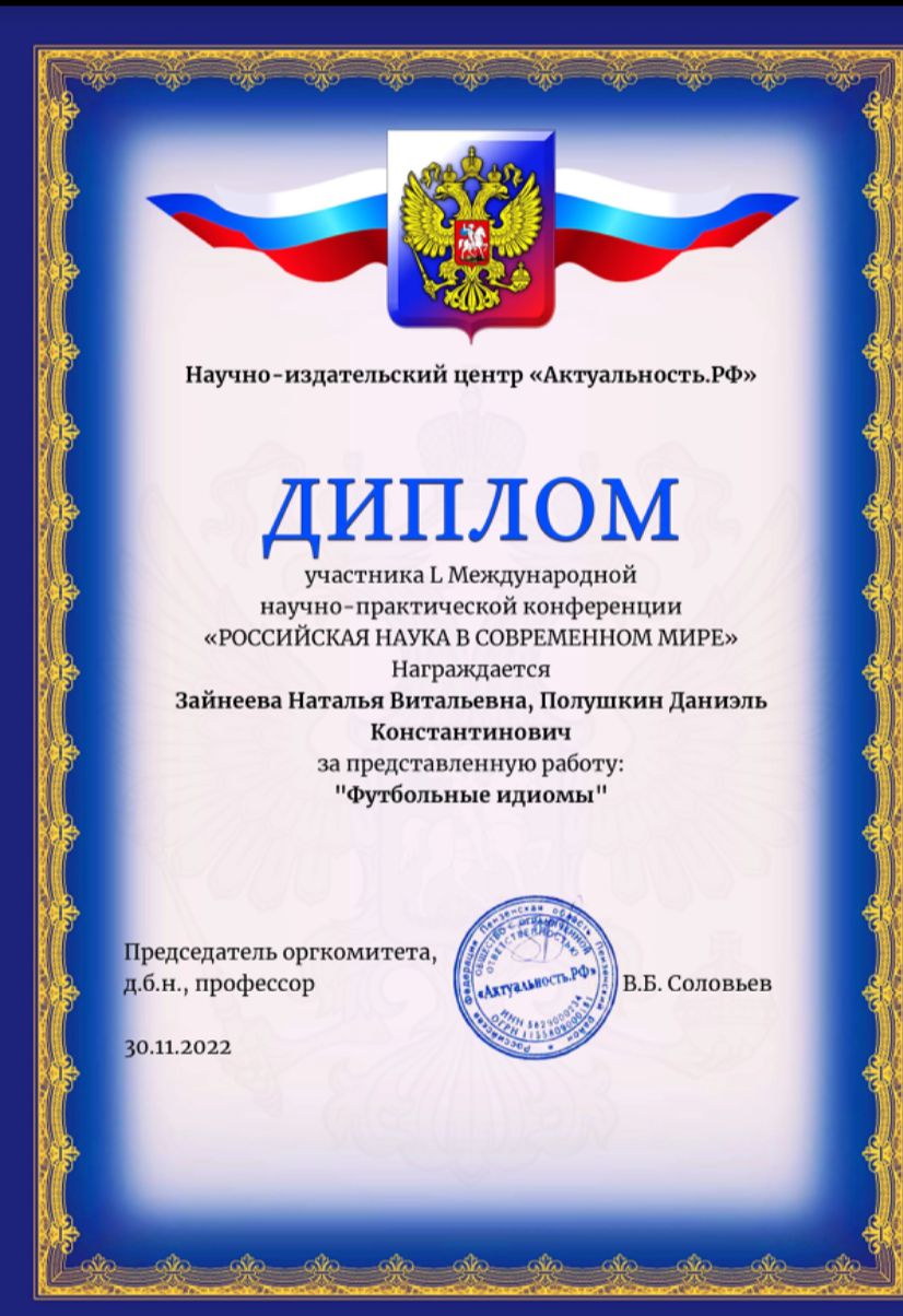«РОССИЙСКАЯ НАУКА В СОВРЕМЕННОМ МИРЕ».  Студент 3-го курса специальности  «Туризм» Полушкин Даниэль под руководством преподавателя Зайнеевой Натальи Витальевны подготовили исследоватескую работу «Футбольные идиомы». По результатам НИЦ будет опубликован сборник статей в системе elibrary.
