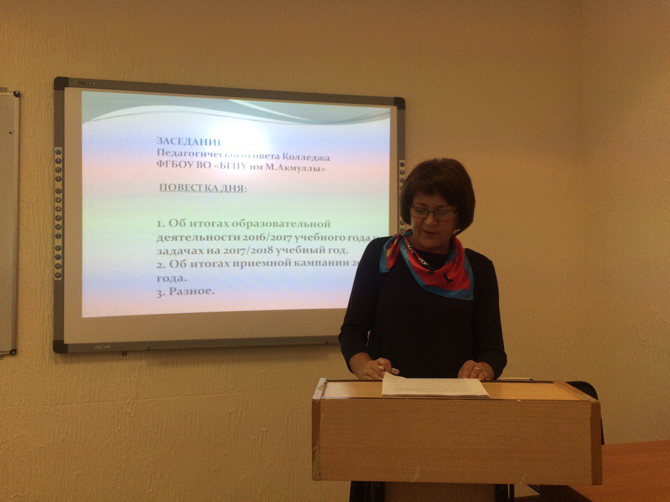 31 августа 2017 года в Колледже БГПУ им. М.Акмуллы состоялся педагогический совет. Итоги 2016-2017 учебного года озвучили зам.директора по УМР А.А.Юферова и зам.директора по УВР В.А.Хафизова. Старший методист Н.Г. Будрина рассказала о перспективных образовательных программах ФГОС СПО по ТОП-50 и ознакомила с графиком повышения квалификаций преподавателей колледжа на 2017-2018 учебный год. Председатель приемной комиссии А.Р. Мукадасова представила отчет о проделанной работе приемной комиссии и ознакомила с мониторингом набора абитуриентов по специальностям. В завершении педсовета директор Колледжа БГПУ им. М.Акмуллы М.А.Курунов обозначил задачи на предстоящий учебный год и вынес на голосование проект решения педсовета.
